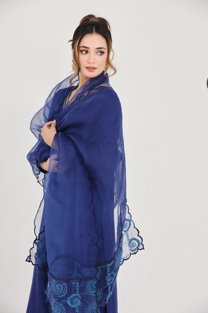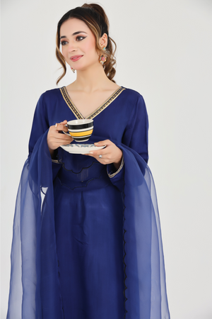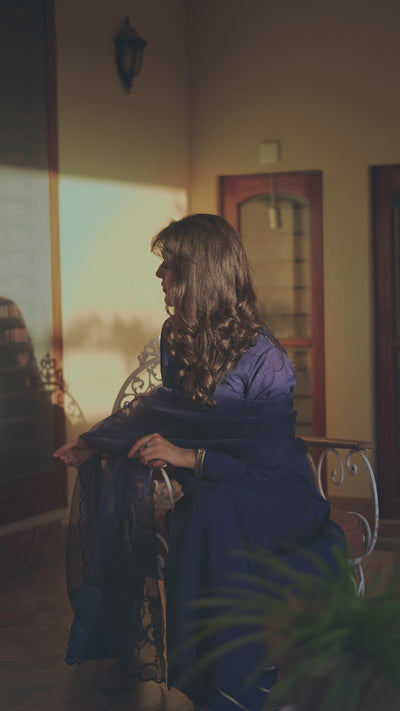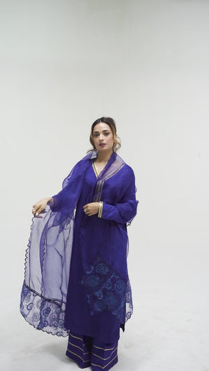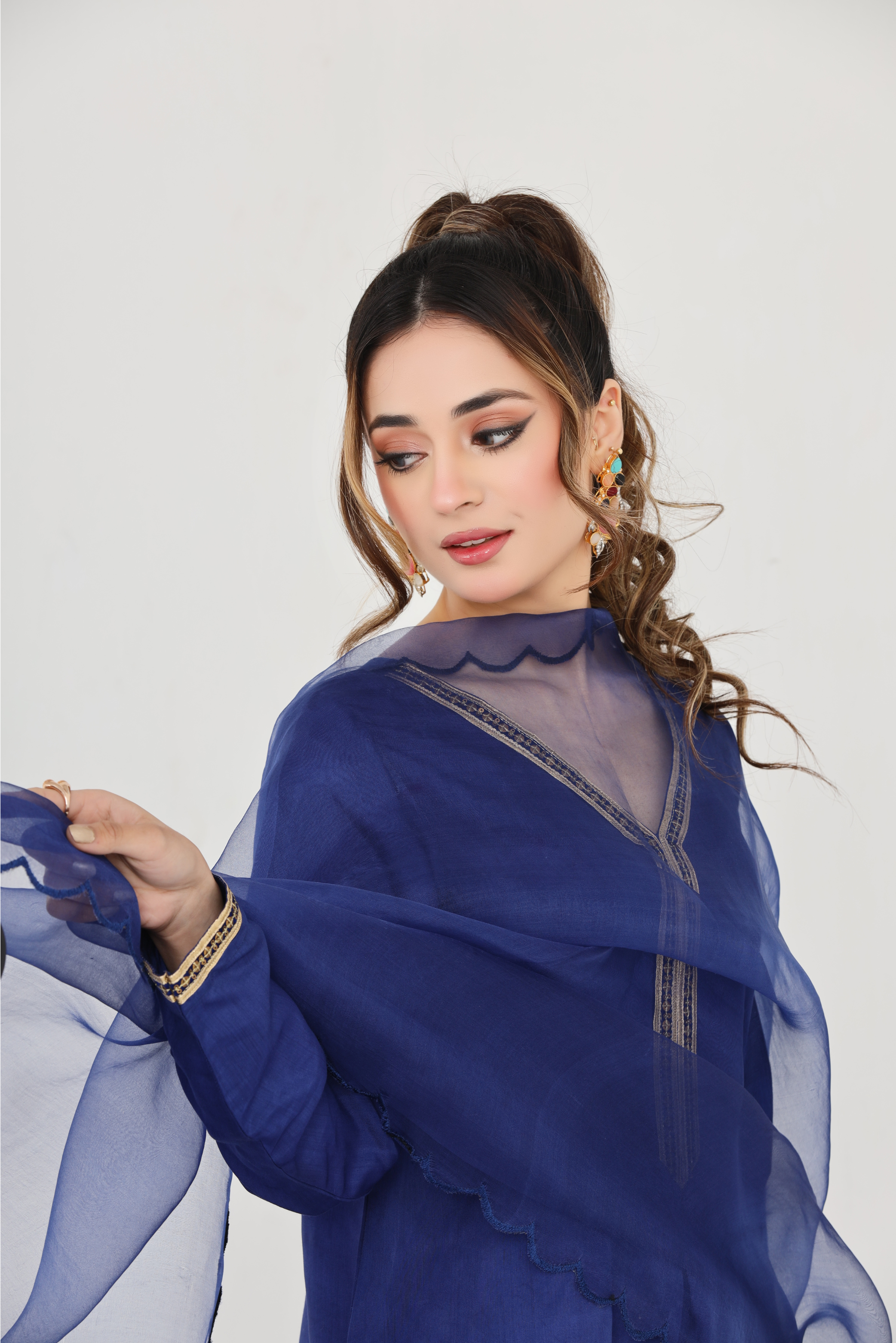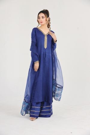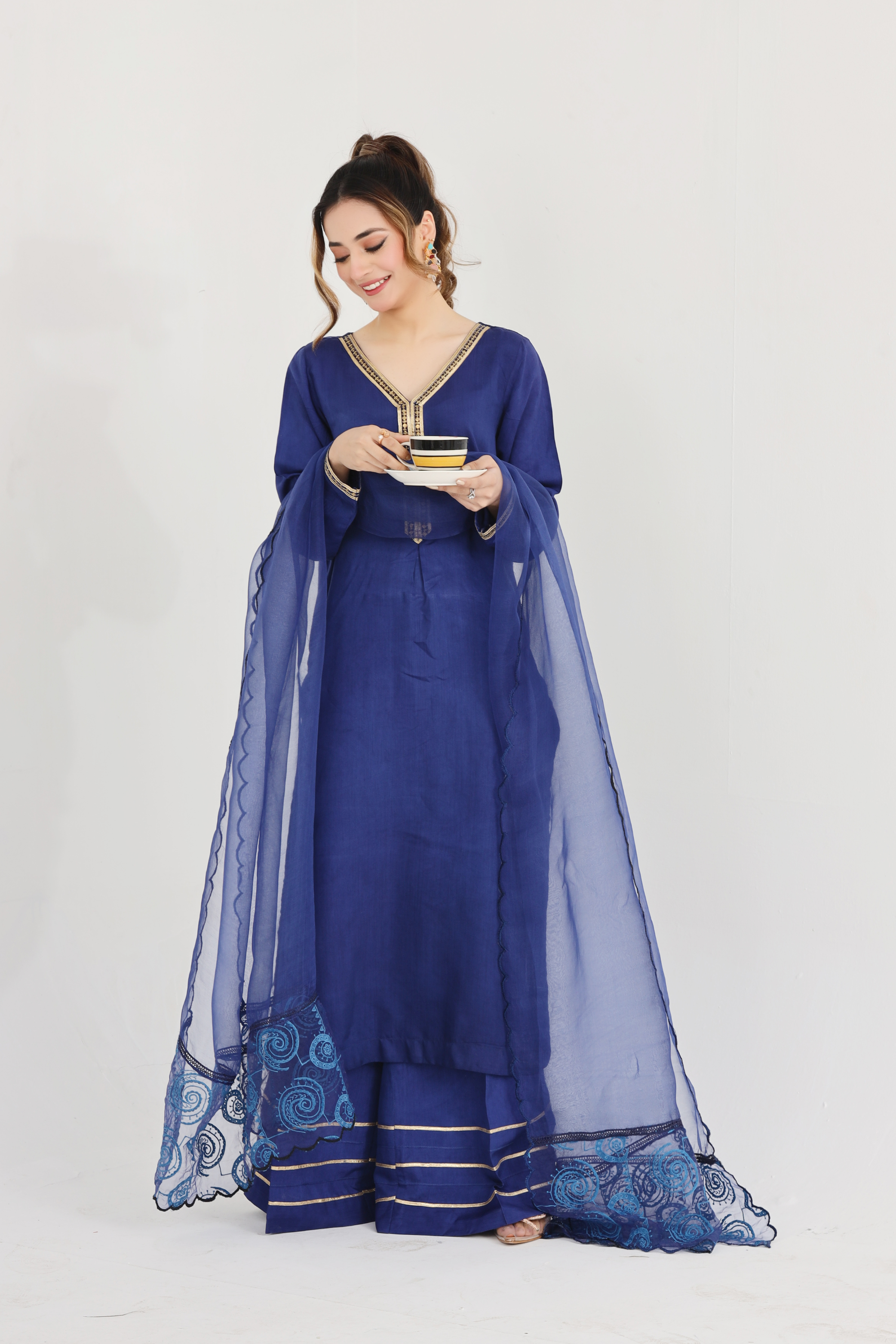 This Dark Indigo blue set features a box pleat Grip Silk shirt with lace and gold pati on the neckline, an organza back with embroidery, and Sheesha Silk palazzo pants with pleats and Gota patti. The organza dupatta with embroidered pallu and scallop completes the look. The shirt length is 48–49 inches & the model is wearing small.