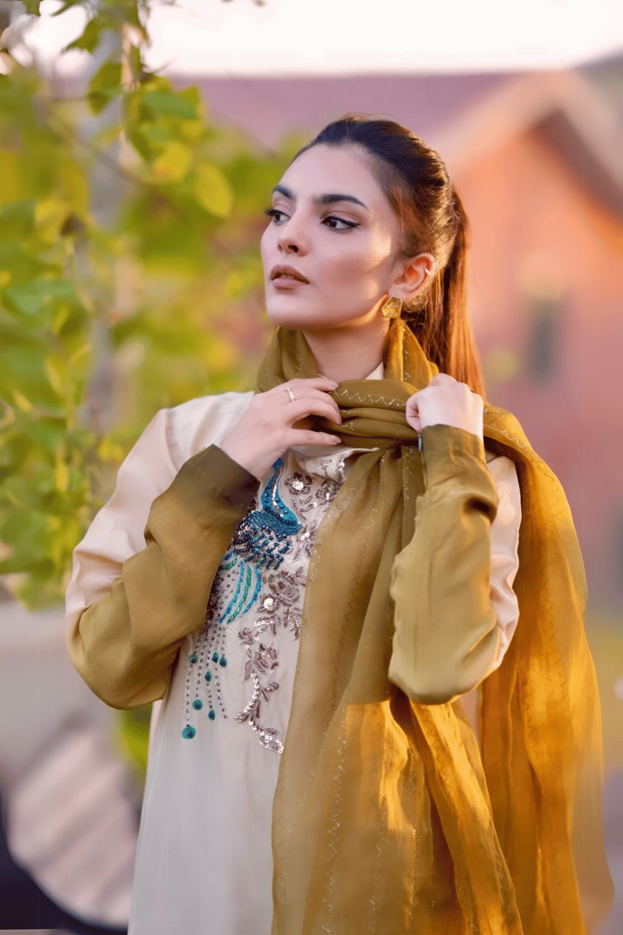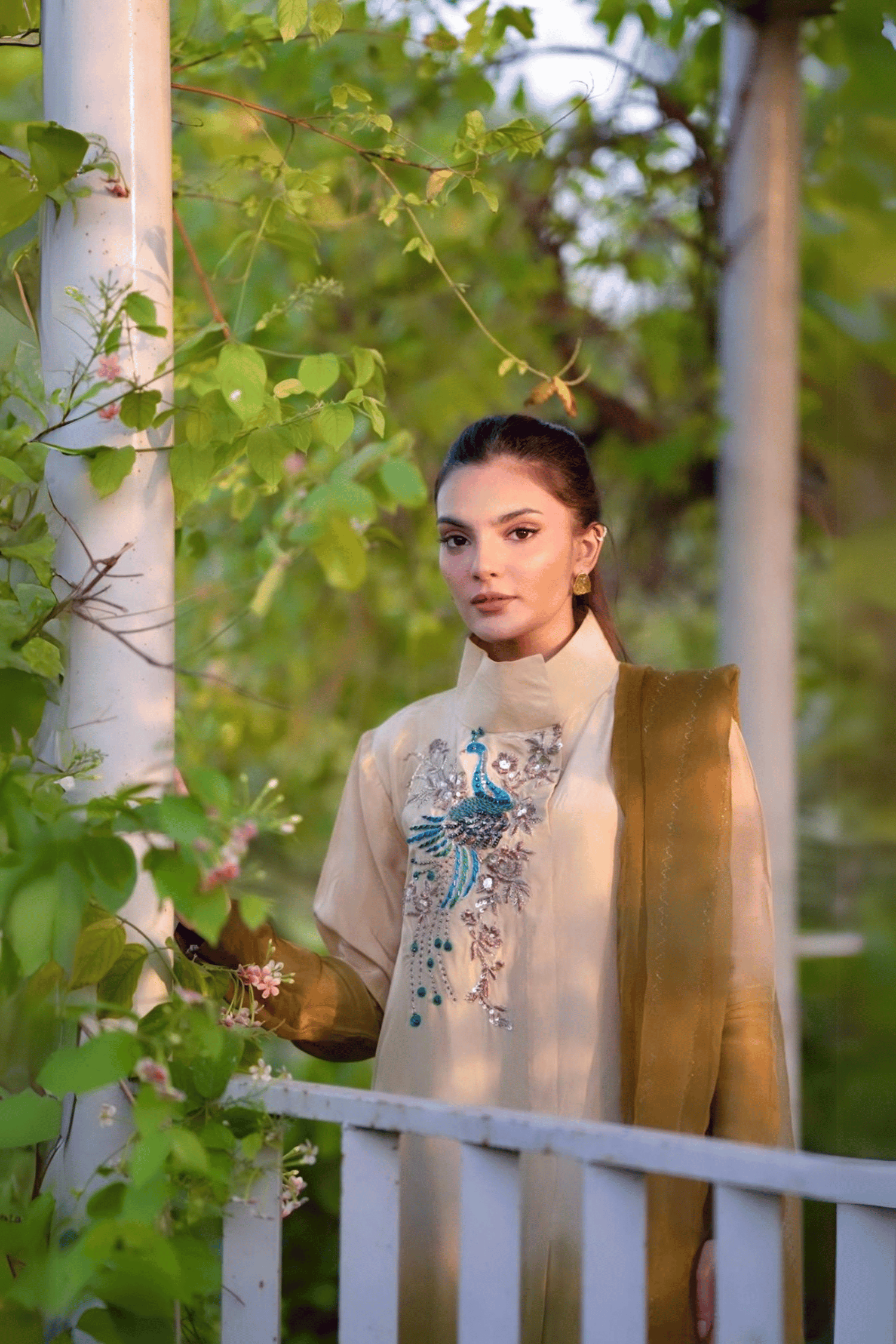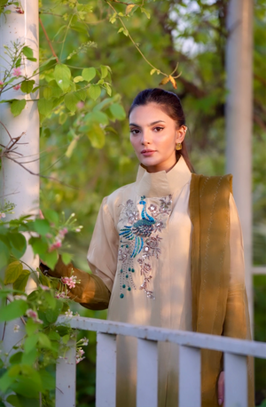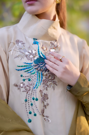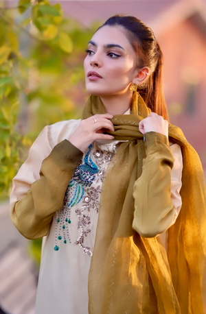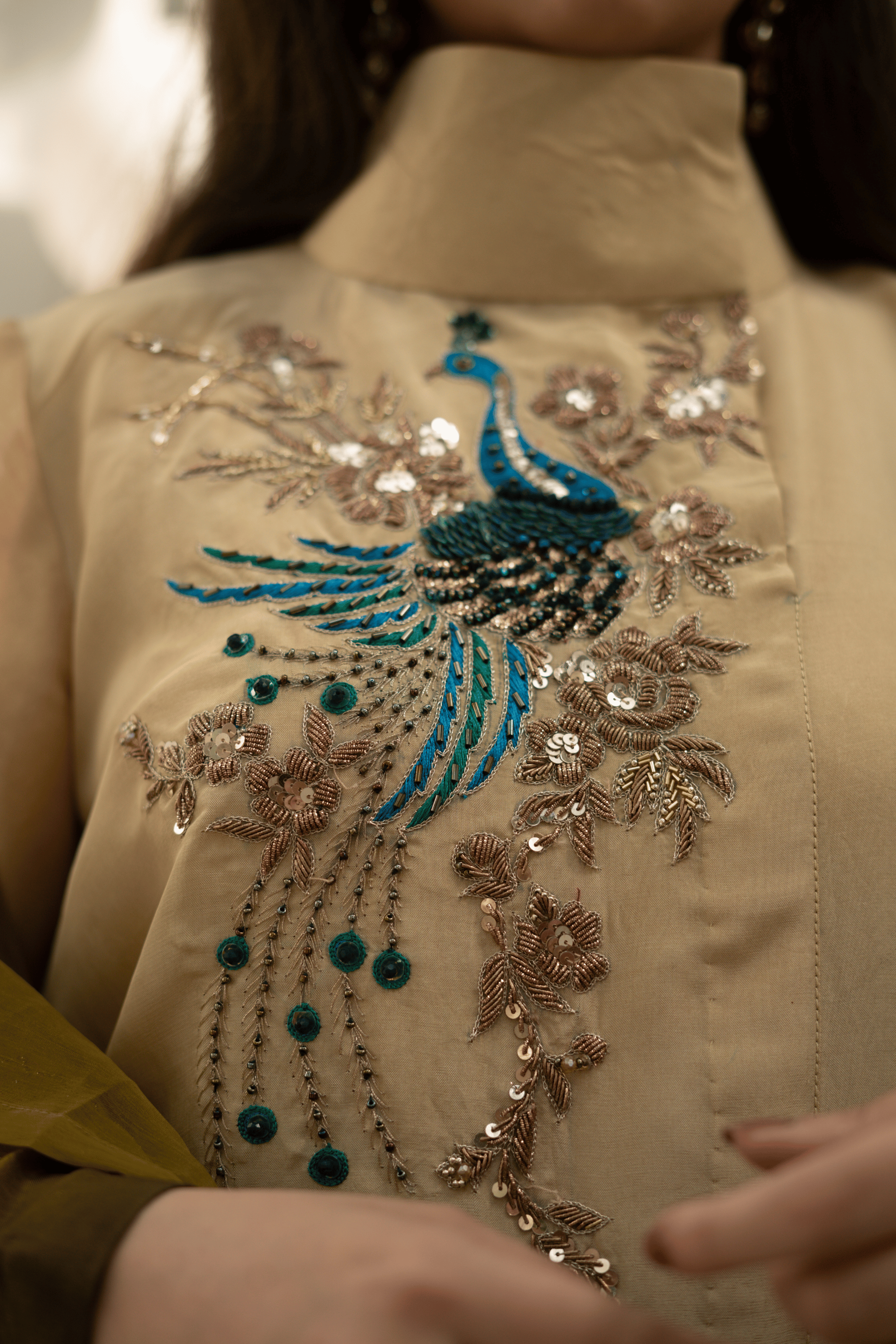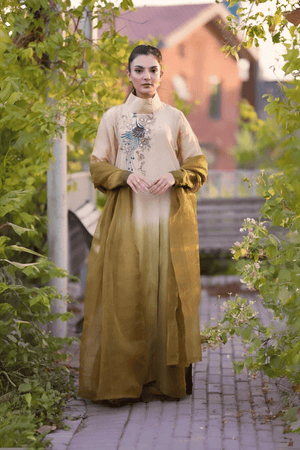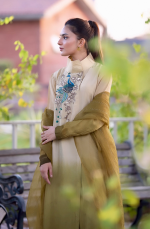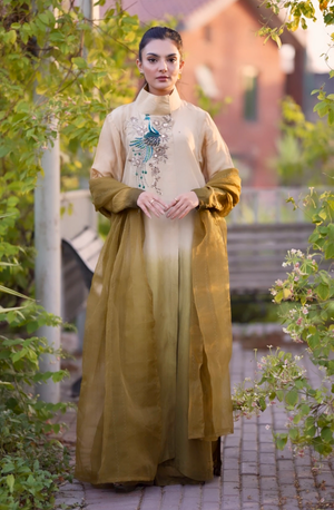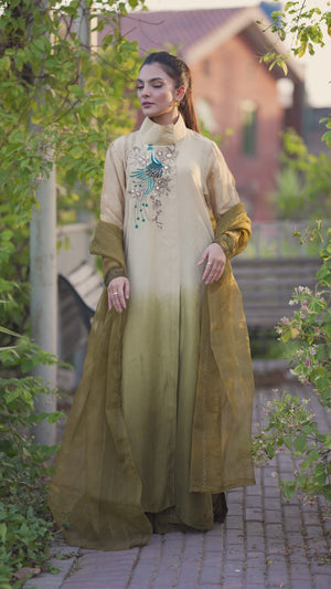 Inspired by nature's rich hues, this Ombre Embellished Outfit features a tailored suit with seamless transitions and peacock-inspired details. Paired with Palazzo pants and organza Dupatta. The length of this shirt is 47 inches & the model is wearing medium size.
