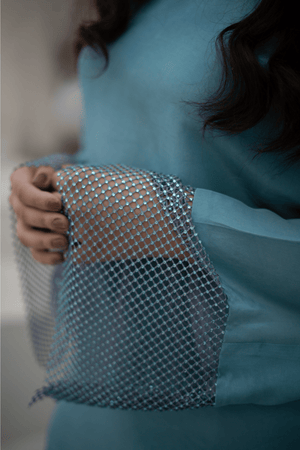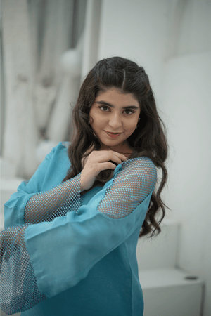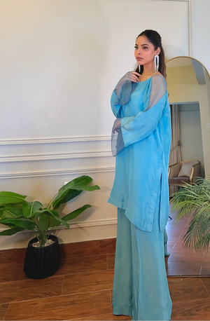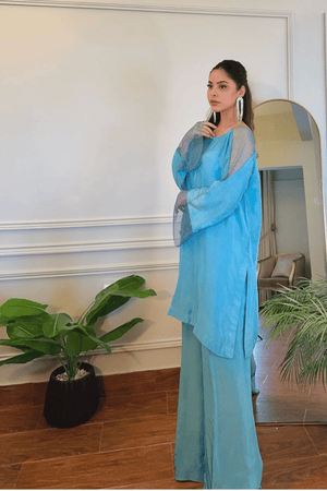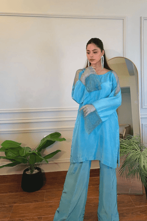 Enhance your style with a Sky Blue Color Outfit featuring exquisite pearl patches on the shoulders and sleeves, complemented by chic bell-bottom pants. You can also add the Organza dubatta to elevate the look. Length of this shirt is inches & the model is wearing small size.