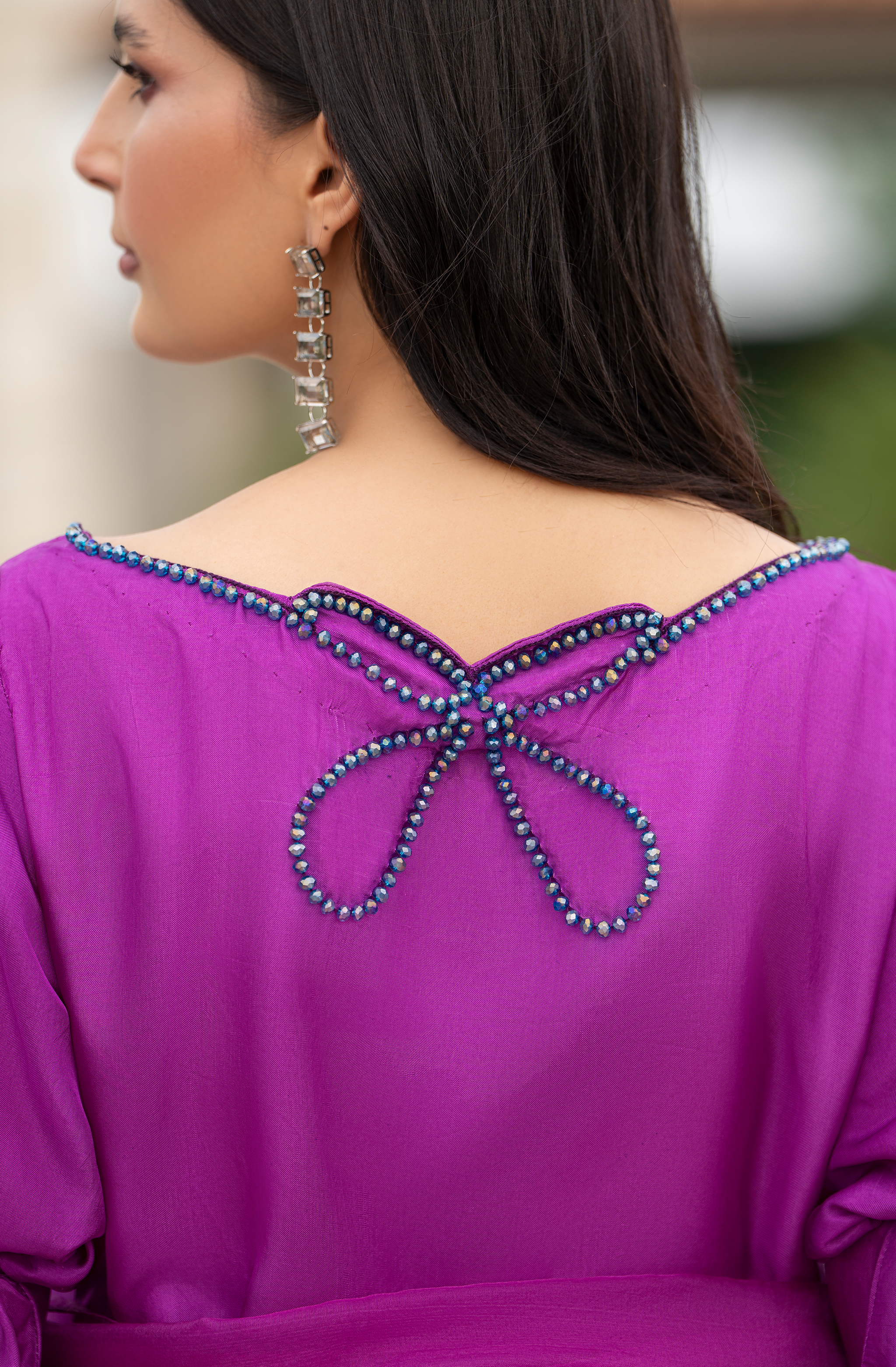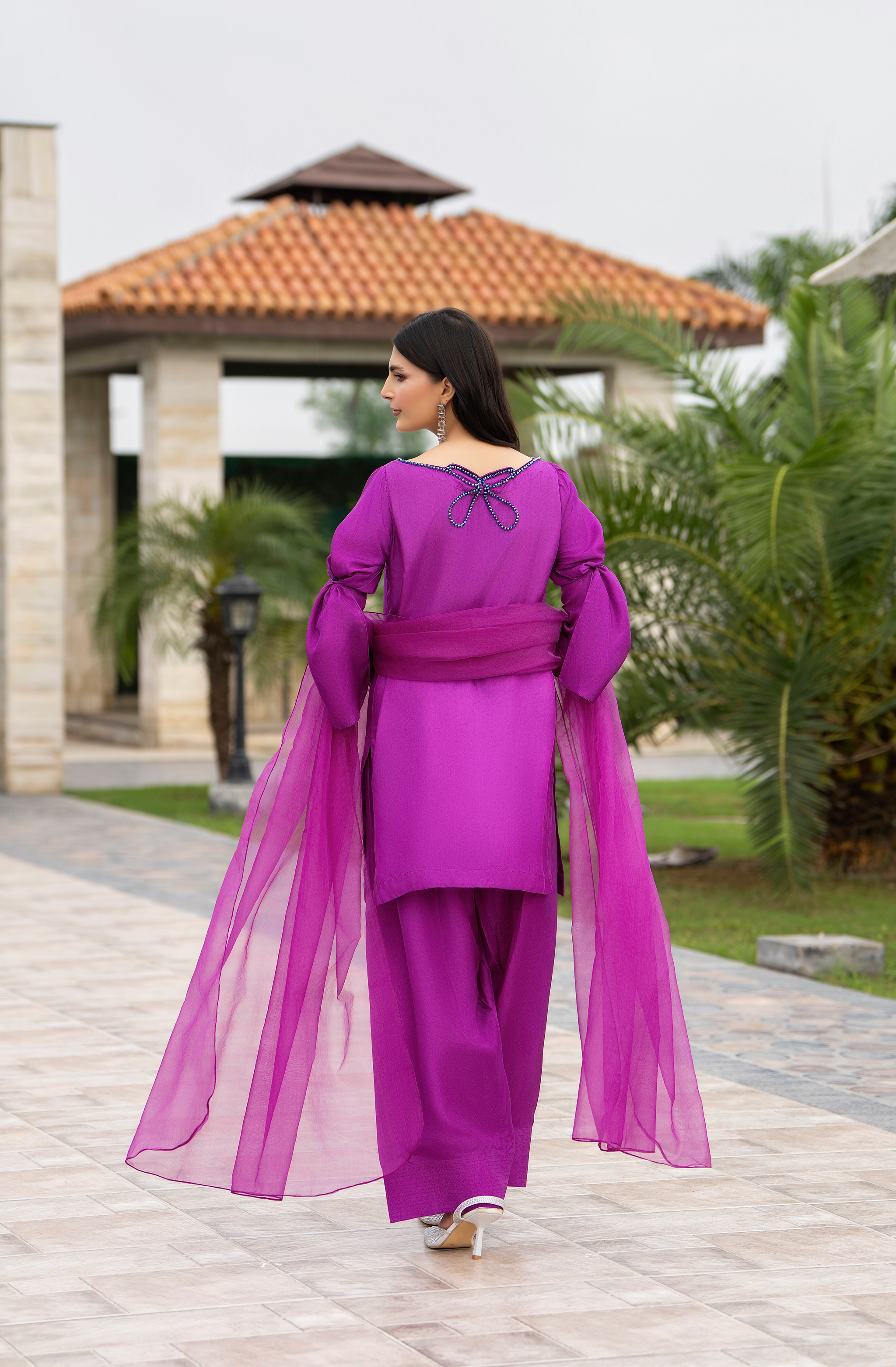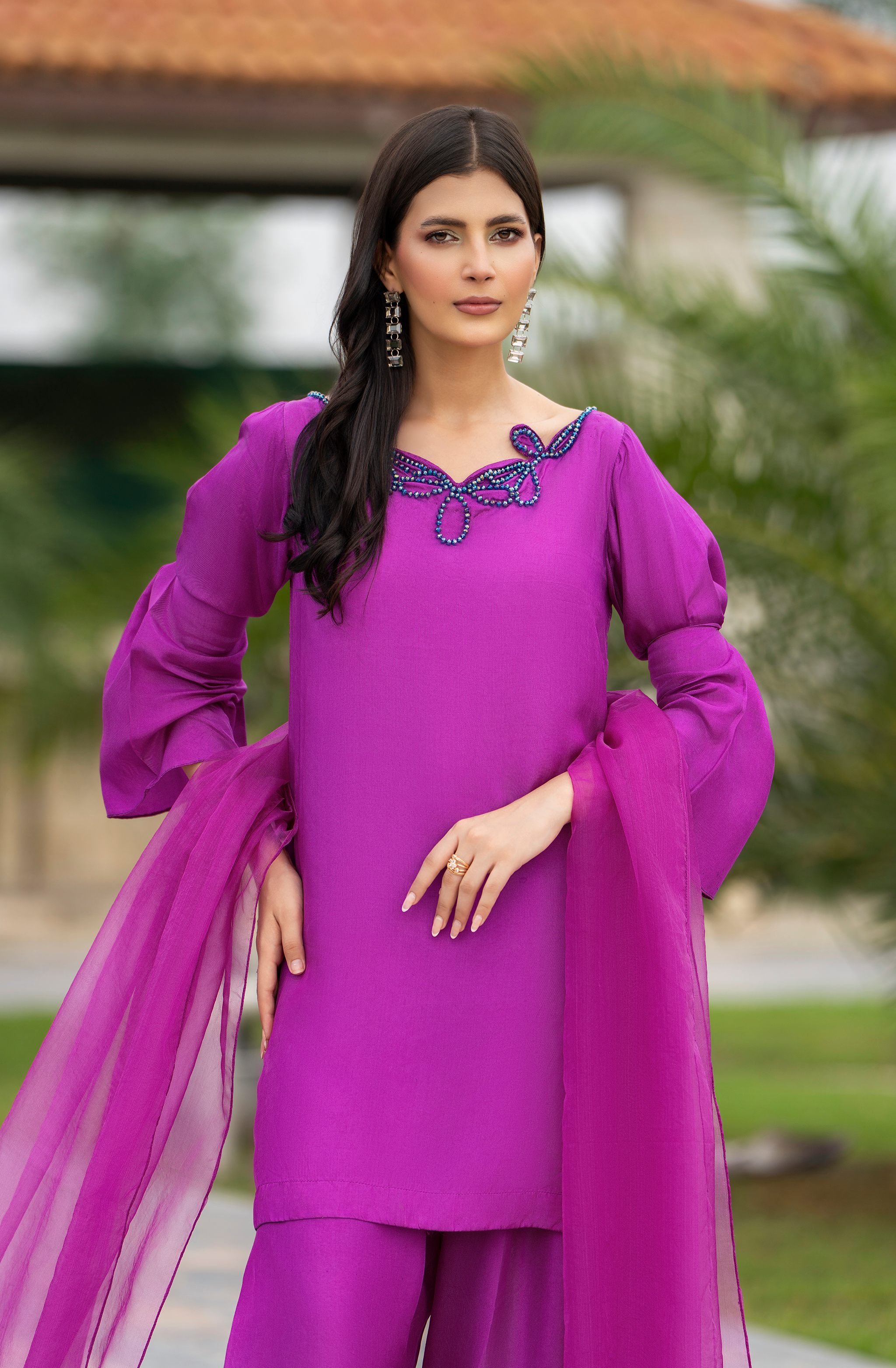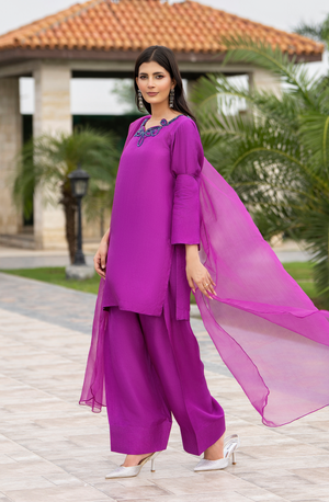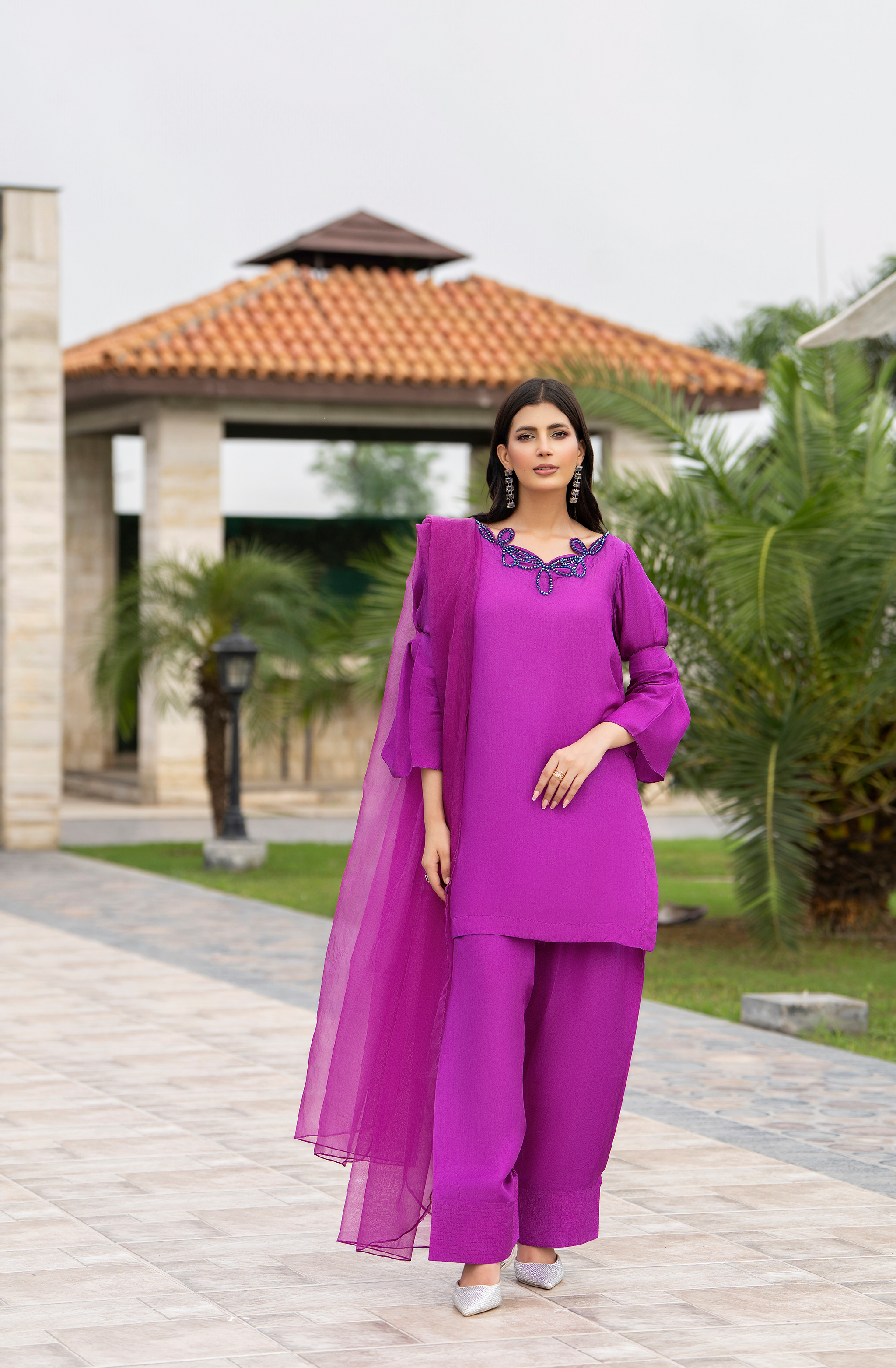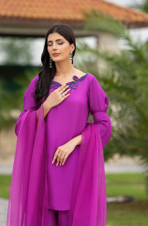 Gulroz is a vibrant 3-piece ensemble crafted in pure dyeable silk. The 33" shirt features delicate beadwork on the neckline, both front and back, adding sparkle to its bold magenta tone. Paired with a flowing farshi shalwar and a sheer organza dupatta, this look brings together floral charm and timeless elegance perfect for festive days or graceful evenings.