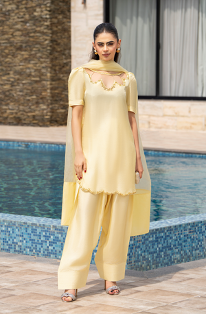 Mehal is a regal 3-piece outfit made from pure dyeable silk in a soft pastel yellow. The shirt features a keyhole neckline adorned with delicate Kora Dabka work on the neckline and daman. It has a rounded hem with cutwork detailing and elbow-length sleeves with gathers for a graceful touch. Paired with a flowy Farshi shalwar and an airy organza dupatta, this look blends tradition with elegance.