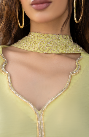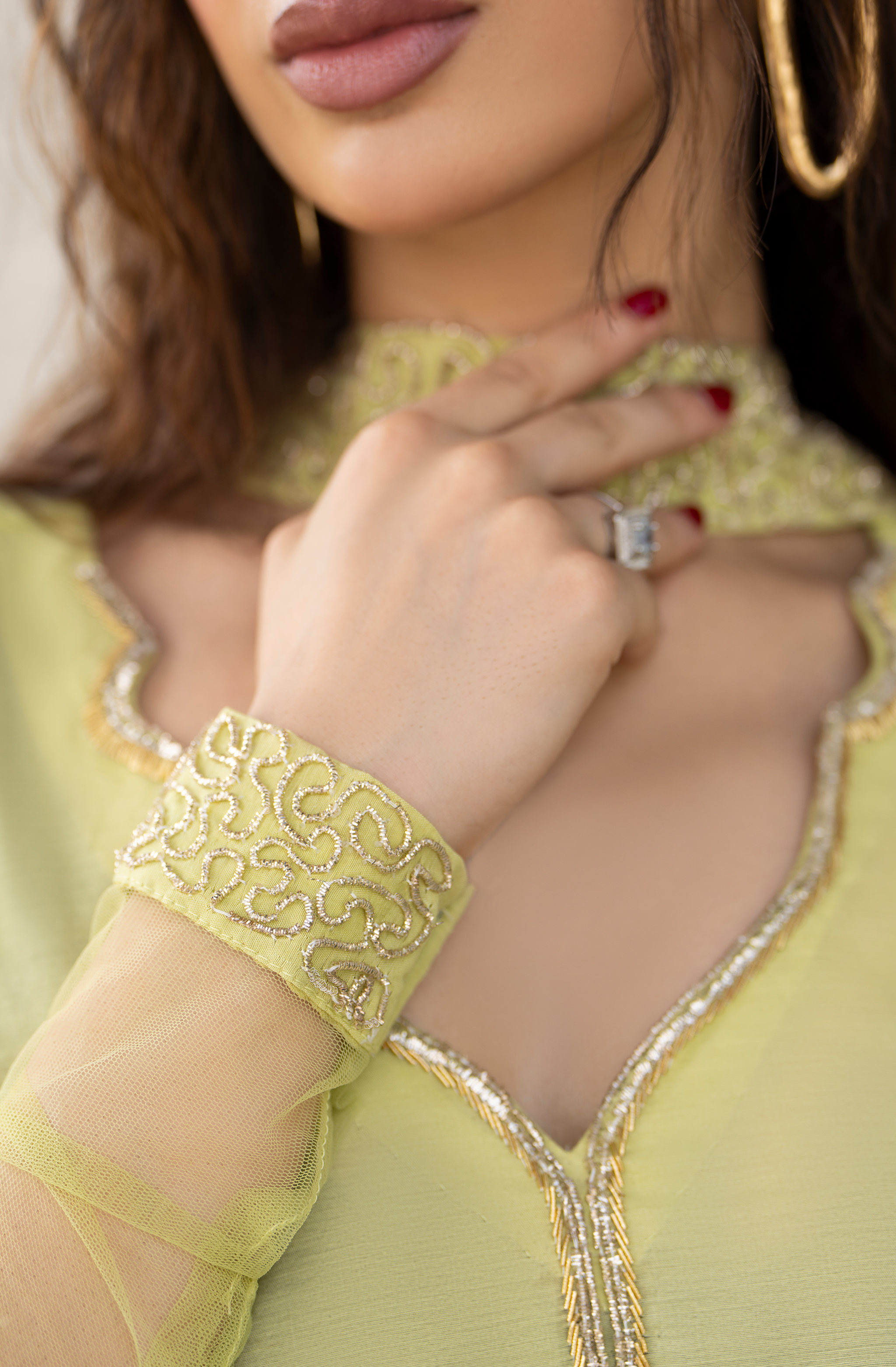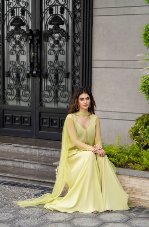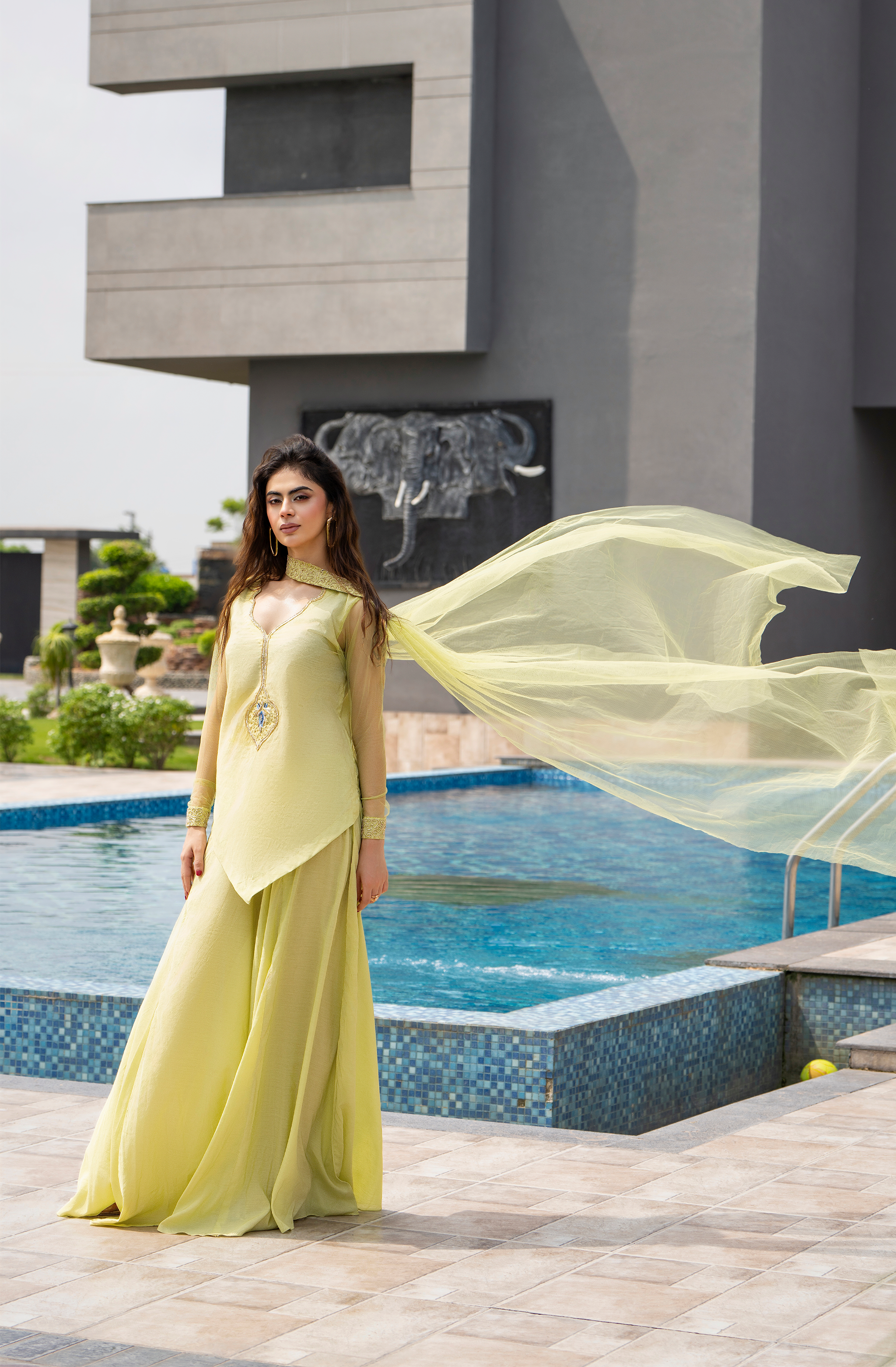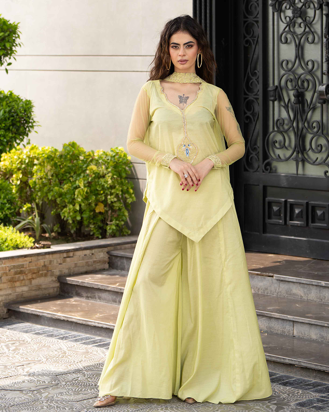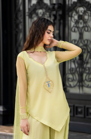 This is a lemon yellow 3-piece suit that blends elegance with simplicity. The shirt features a new front-cut design, net sleeves, and delicate handwork on the neckline. It is paired with flowy palazzo pants and a beautifully worked net dupatta that adds a graceful finish. Ideal for dholkis, brunches, or summer festivities.