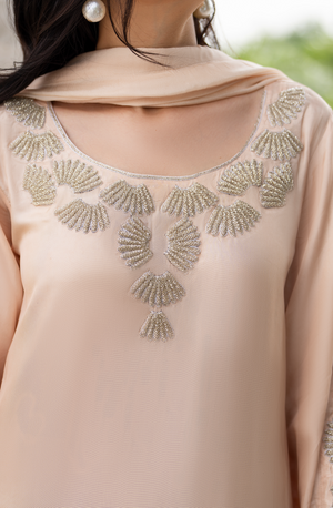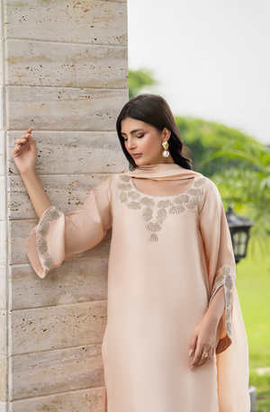 "mahv" is a soft and elegant outfit made from pure silk. The shirt features delicate cut Dana work on the neckline and sleeves, giving it a subtle shine. Paired with straight cigarette pants in matching silk, the look is both graceful and modern. A light silk chiffon dupatta completes the outfit, adding flow and charm. Perfect for both day and evening wear