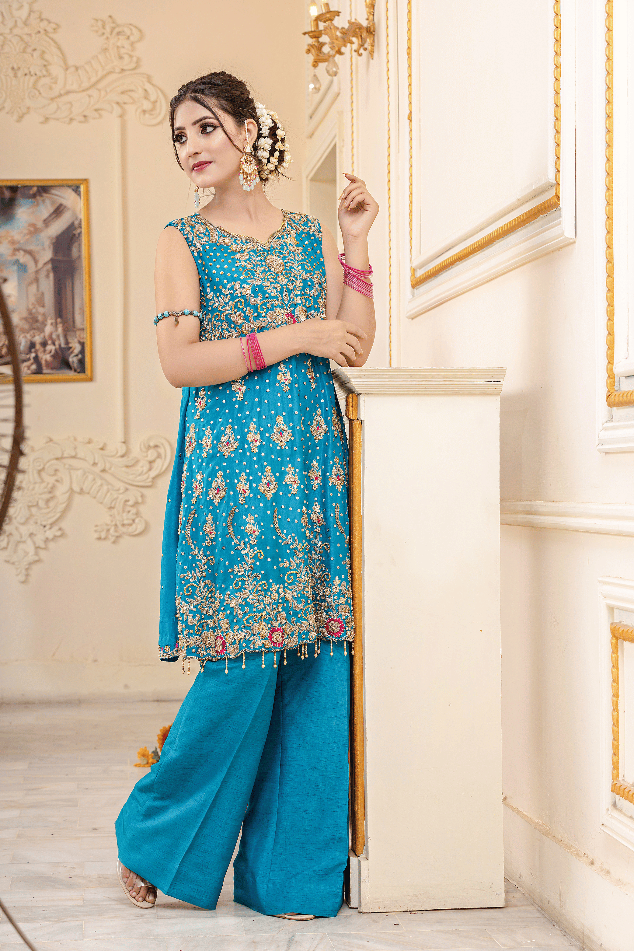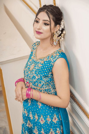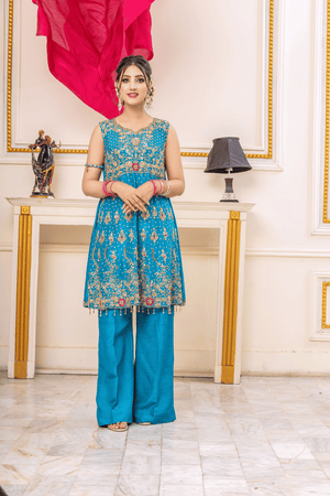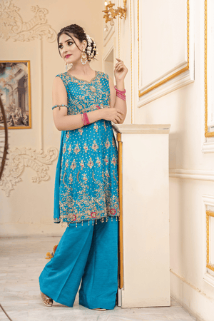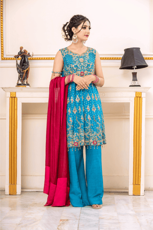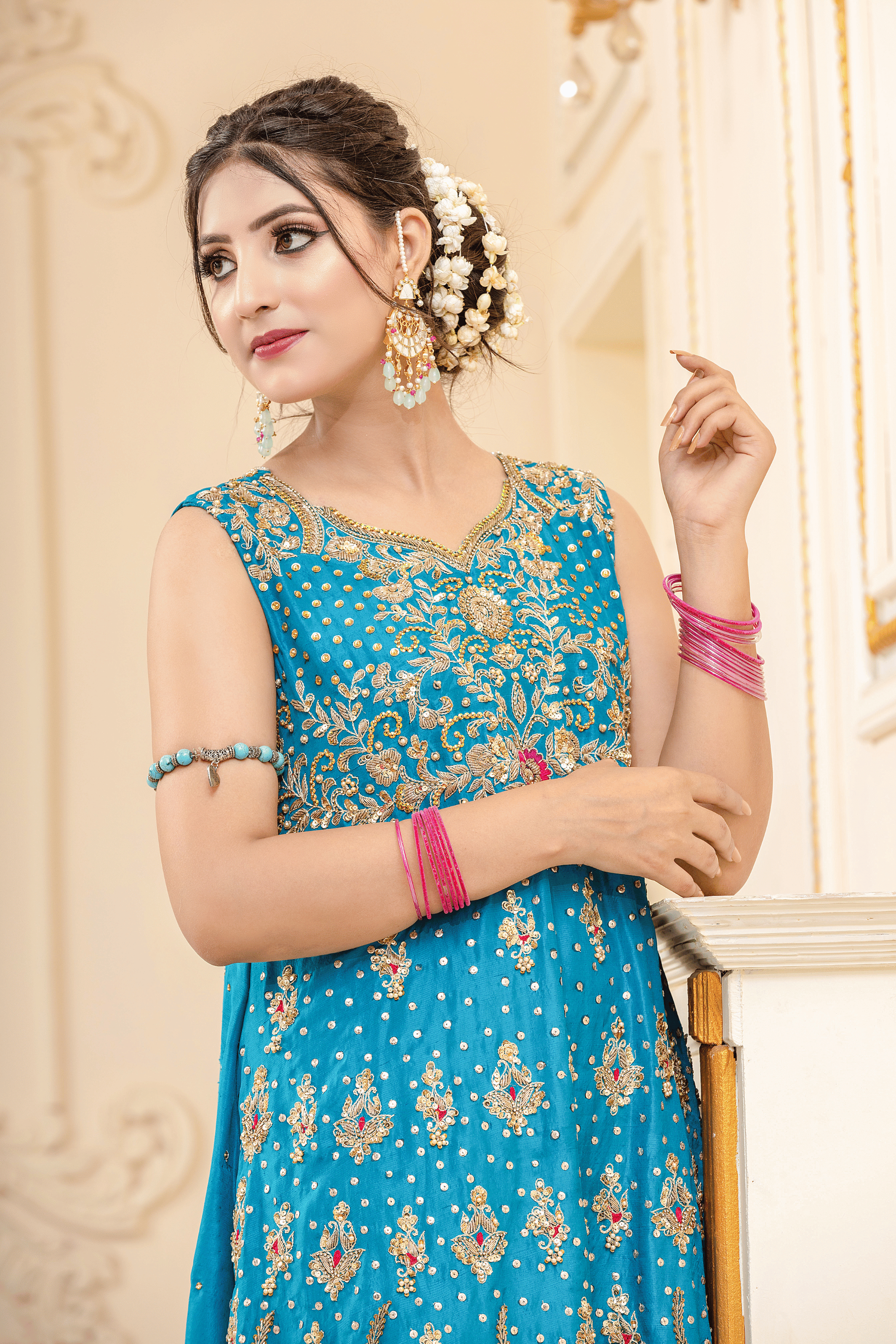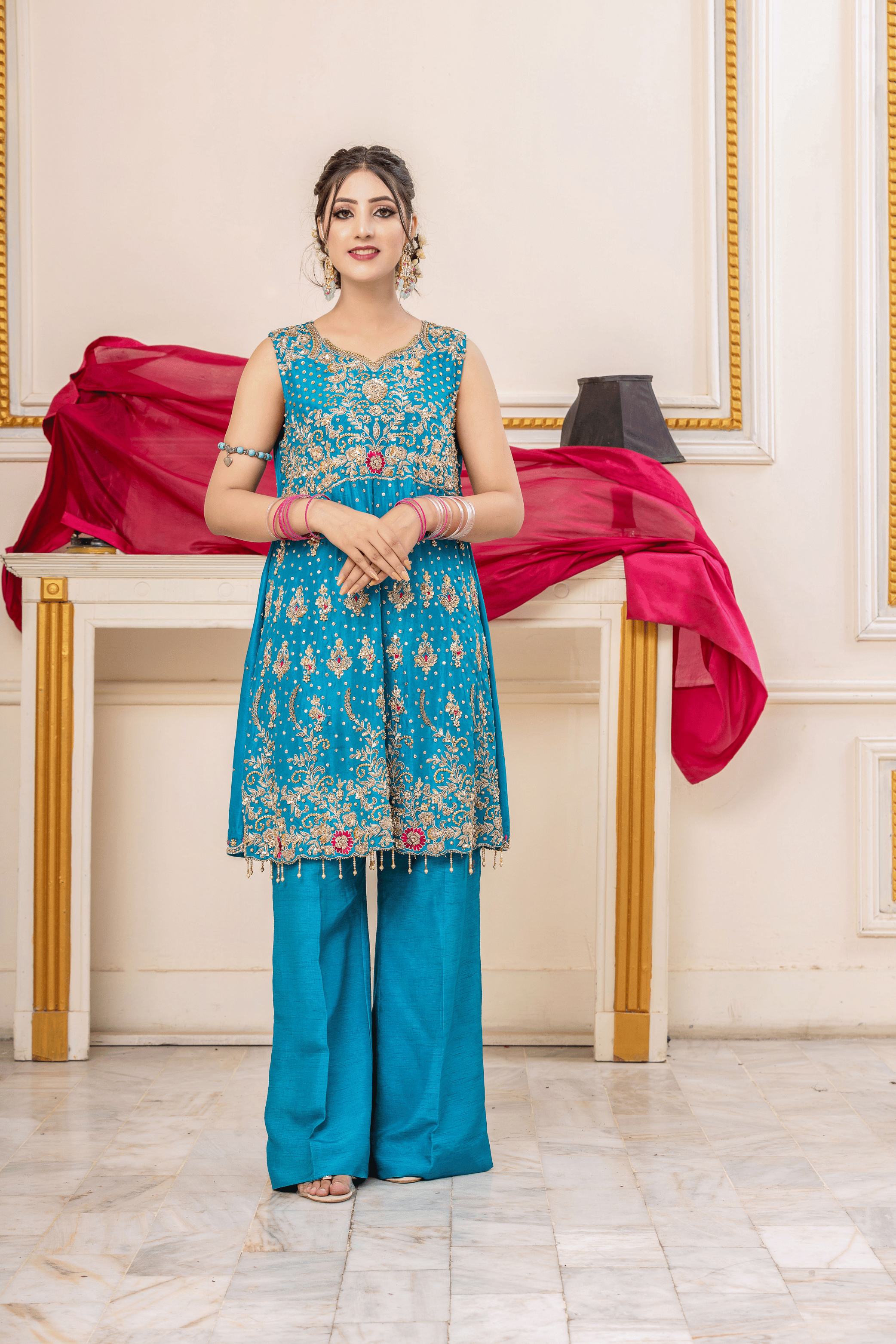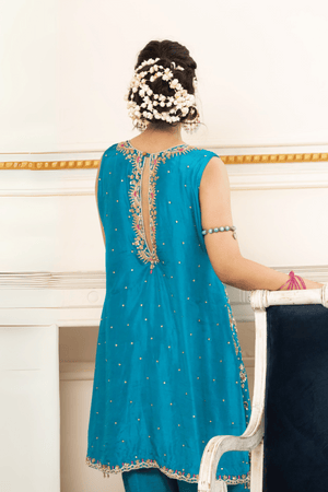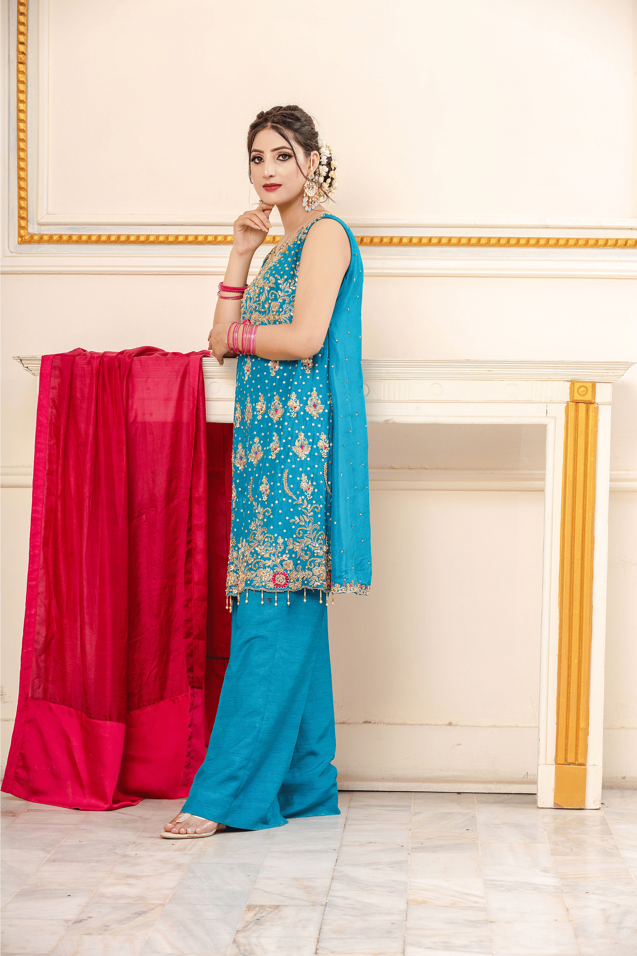 This Deep Sky Blue dress, crafted from 80g Raw Silk, features hand Arri work with Kora Dabka and Resham embellishments on the front. The boxy A-line shirt is detailed with bead hangings along the borders and is complemented by a fuchsia Medium Silk dupatta. Length of this shirt is 34-35 inches & the model is wearing medium size.