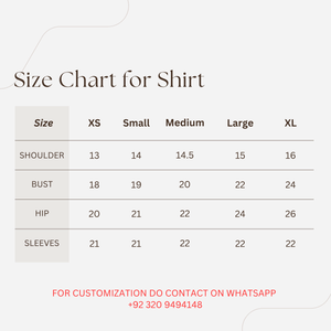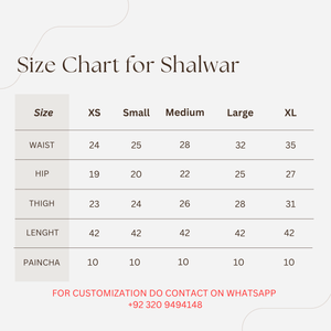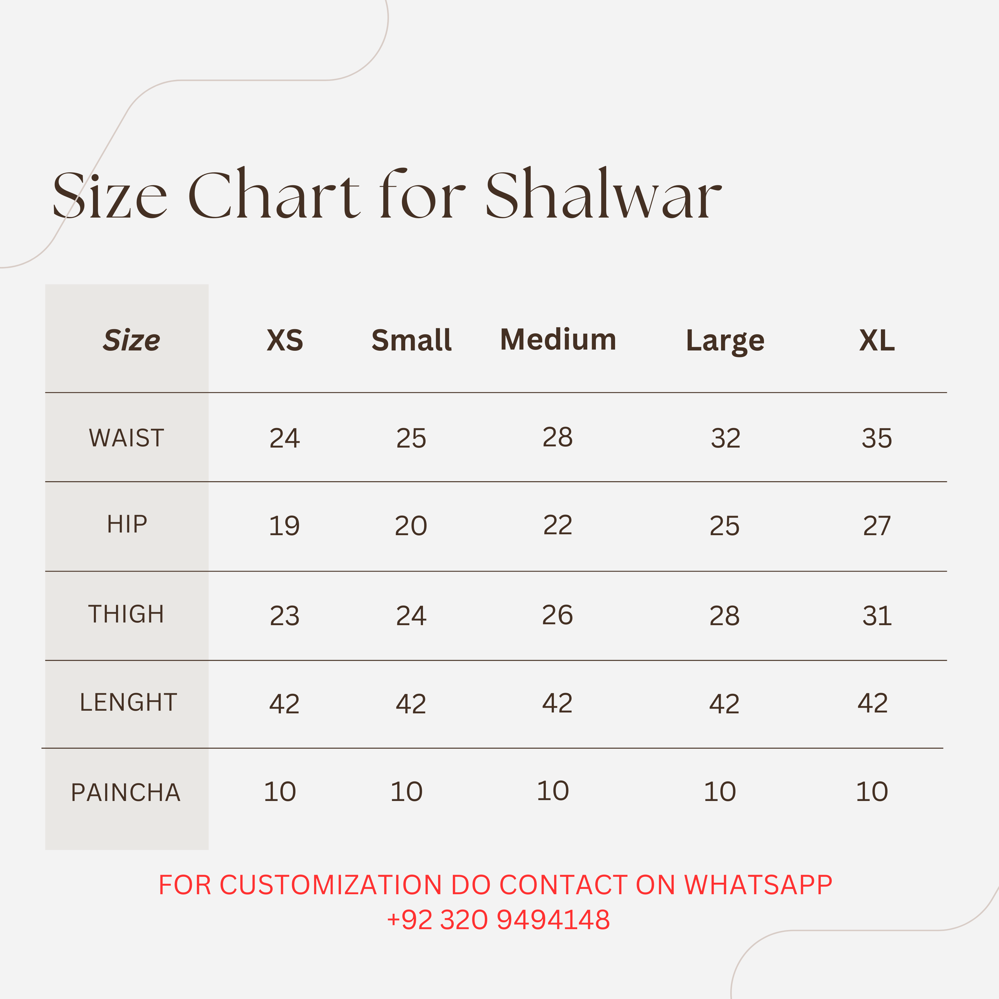 | Shalwar | Waist | 24 | 25 | 28 | 32 | 35 |