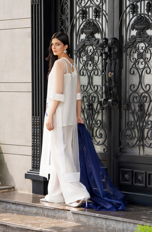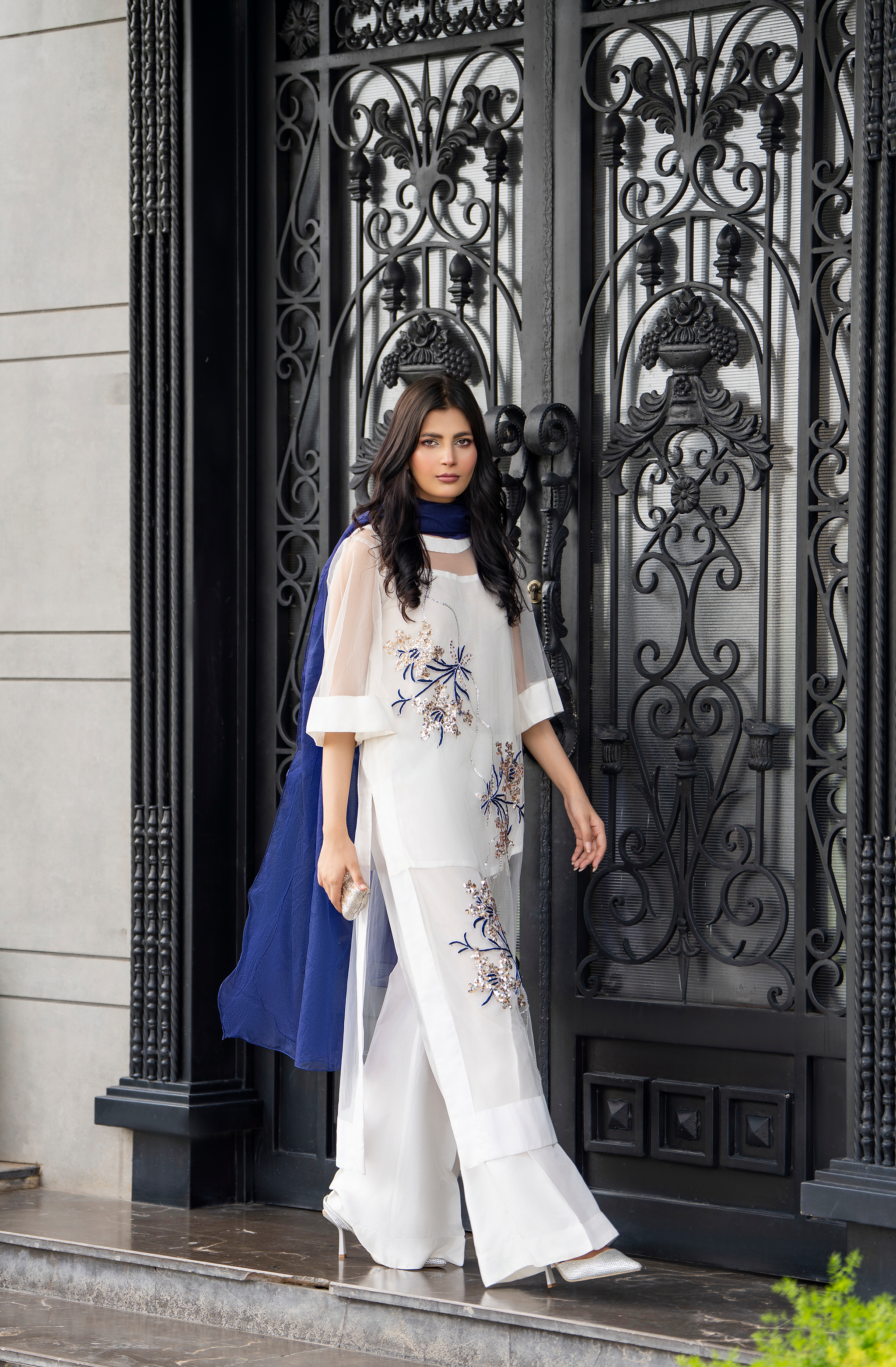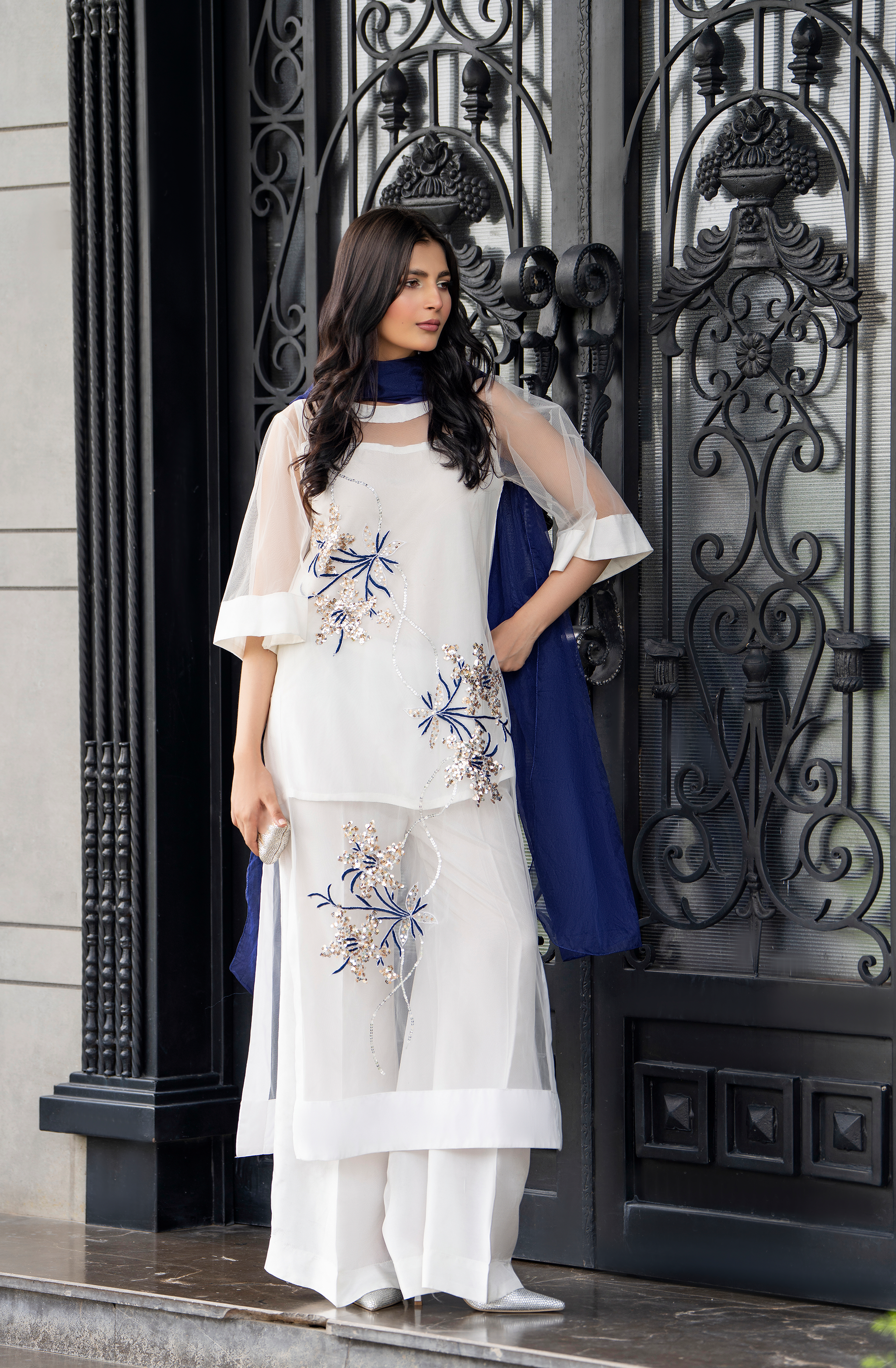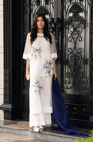 Mahveen is a stunning white 3-piece ensemble that captures timeless charm. The 50-inch net shirt is delicately adorned with sitara work and floral embroidery in silver and navy hues. It comes with a soft organza dupatta and flared bell-bottom trousers made from pure dyeable silk. A cotton silk slip is included underneath, with a customizable size for the perfect fit. Elegant and airy — ideal for formal evenings and summer celebrations.