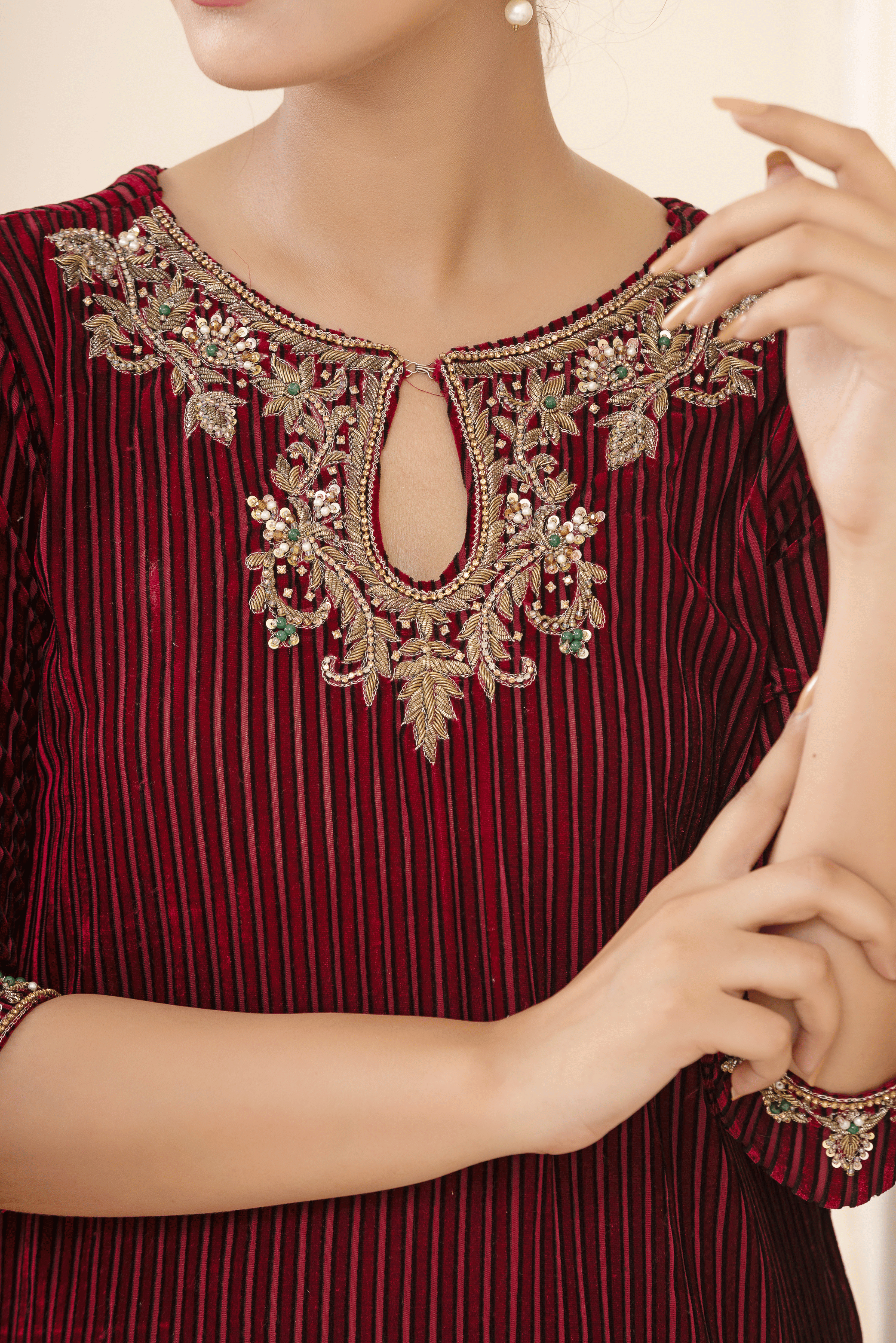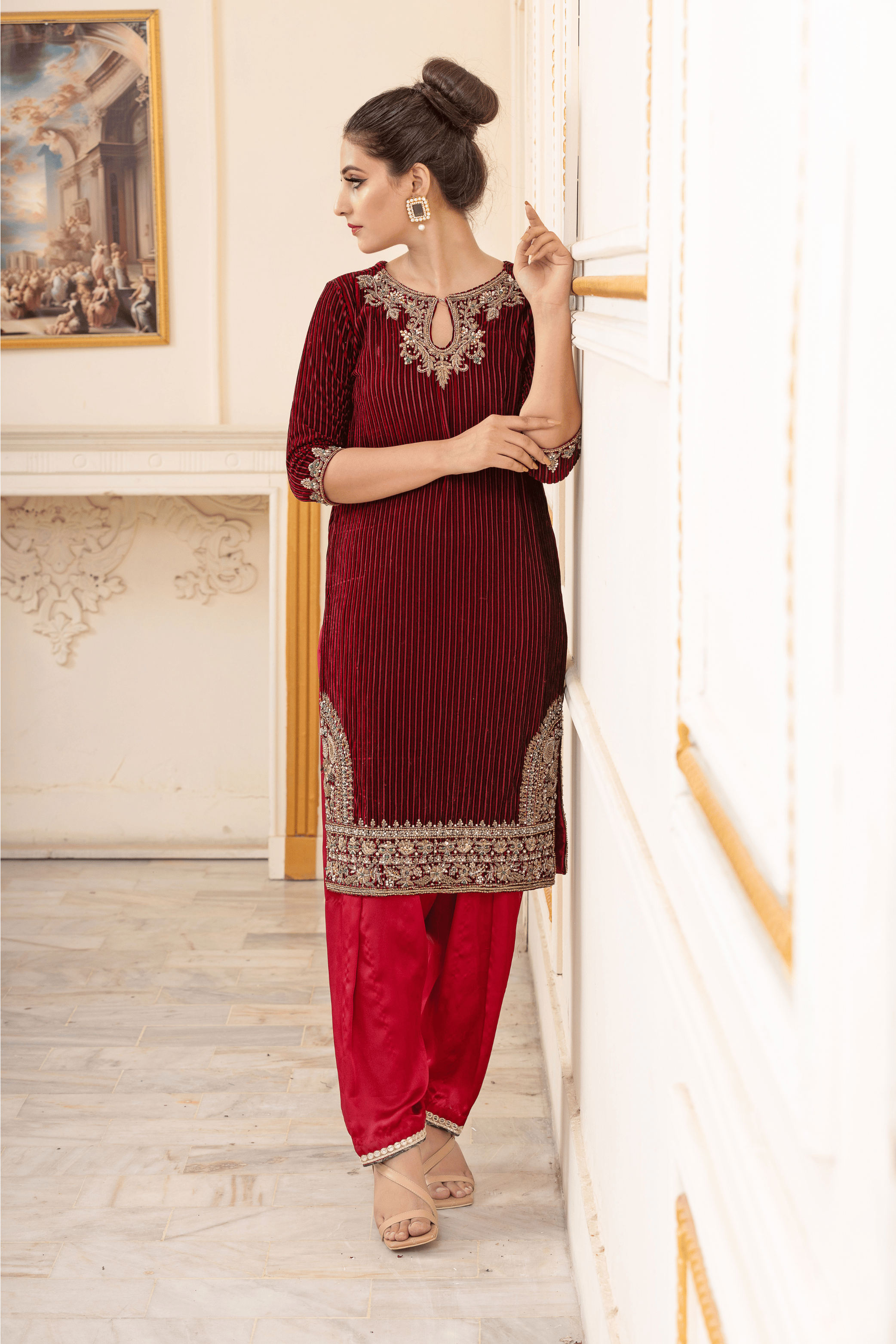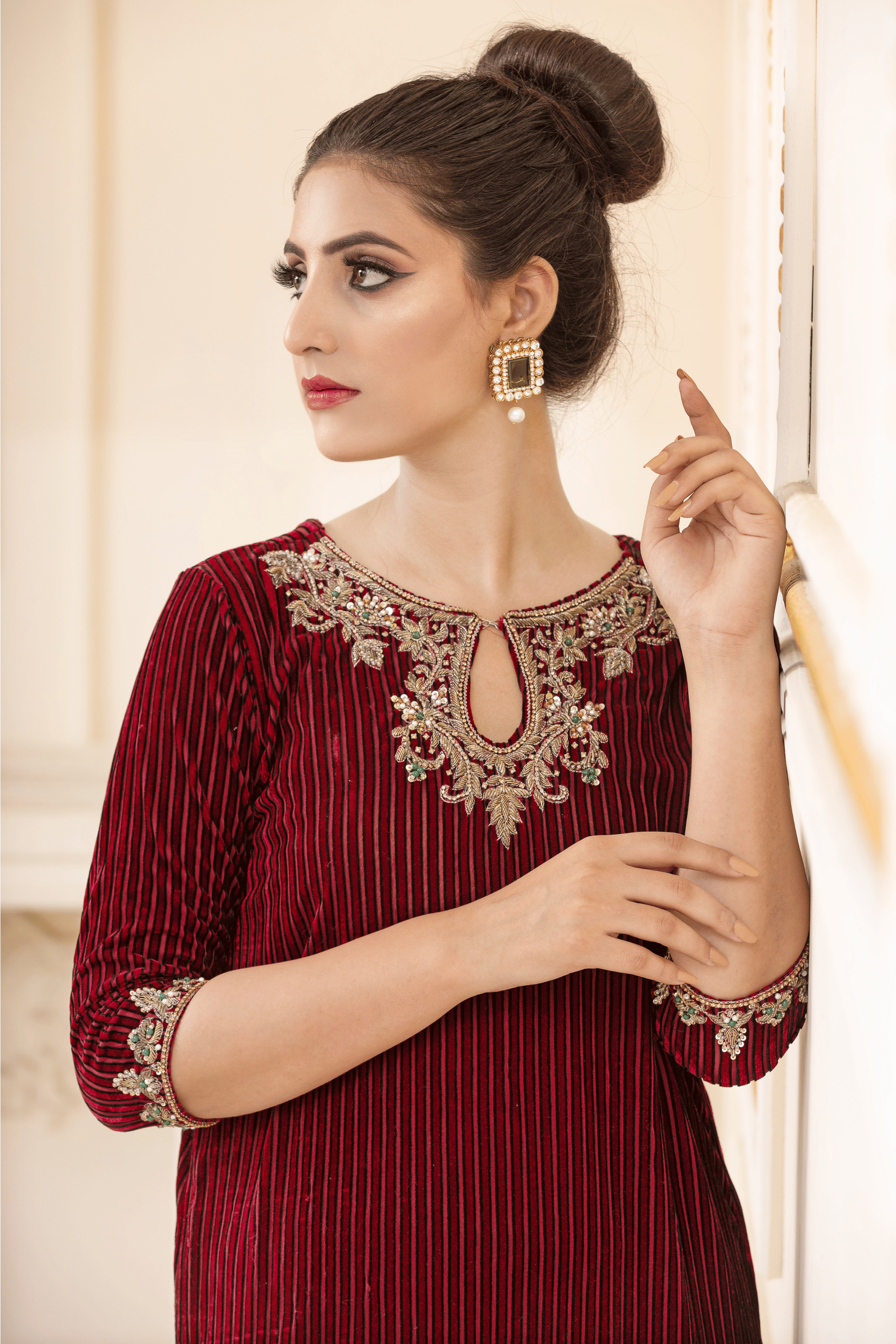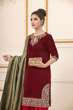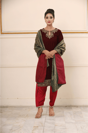 This beautiful Dark Maroon velvet outfit has elegant embroidery (adda work) around the neckline and along the border. Paired with a rich green jamawar dupatta and silk shalwar, it’s perfect for formal events. The deep maroon and green color make this dress look regal and stylish. Length of this shirt is 35-36 inches & the model is wearing small size.
