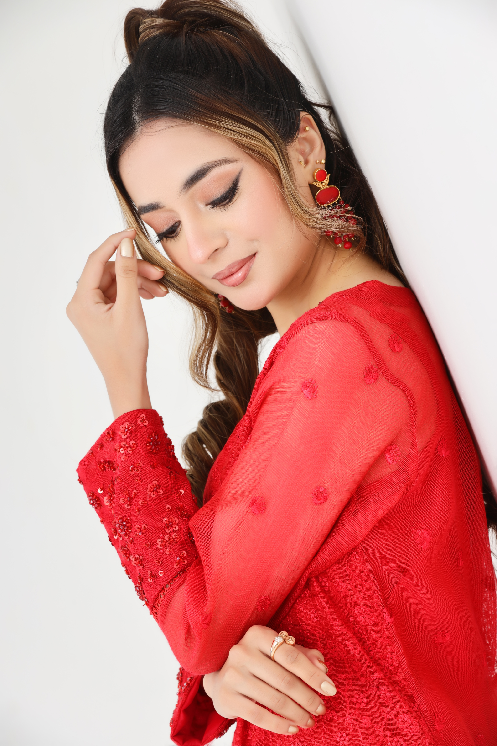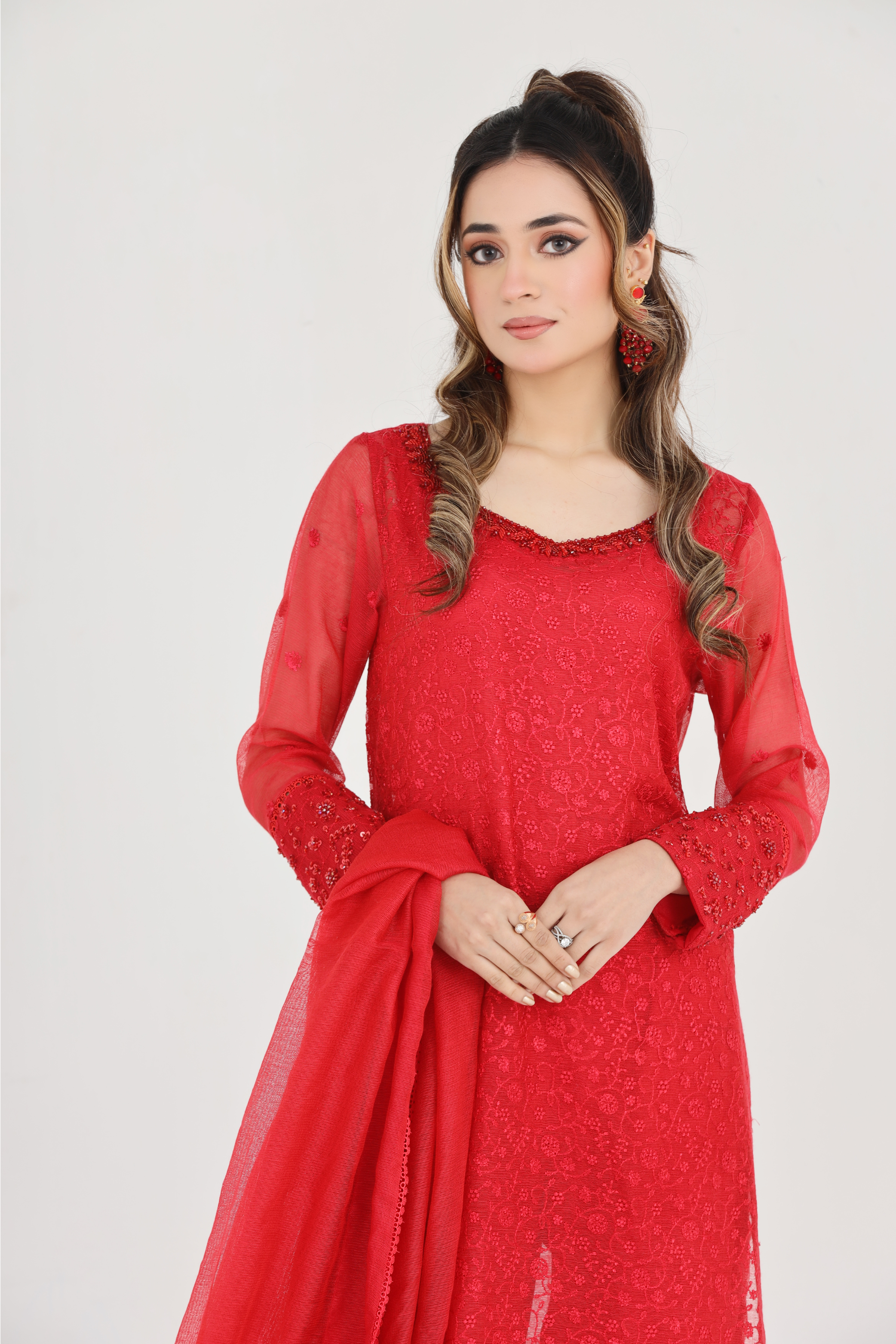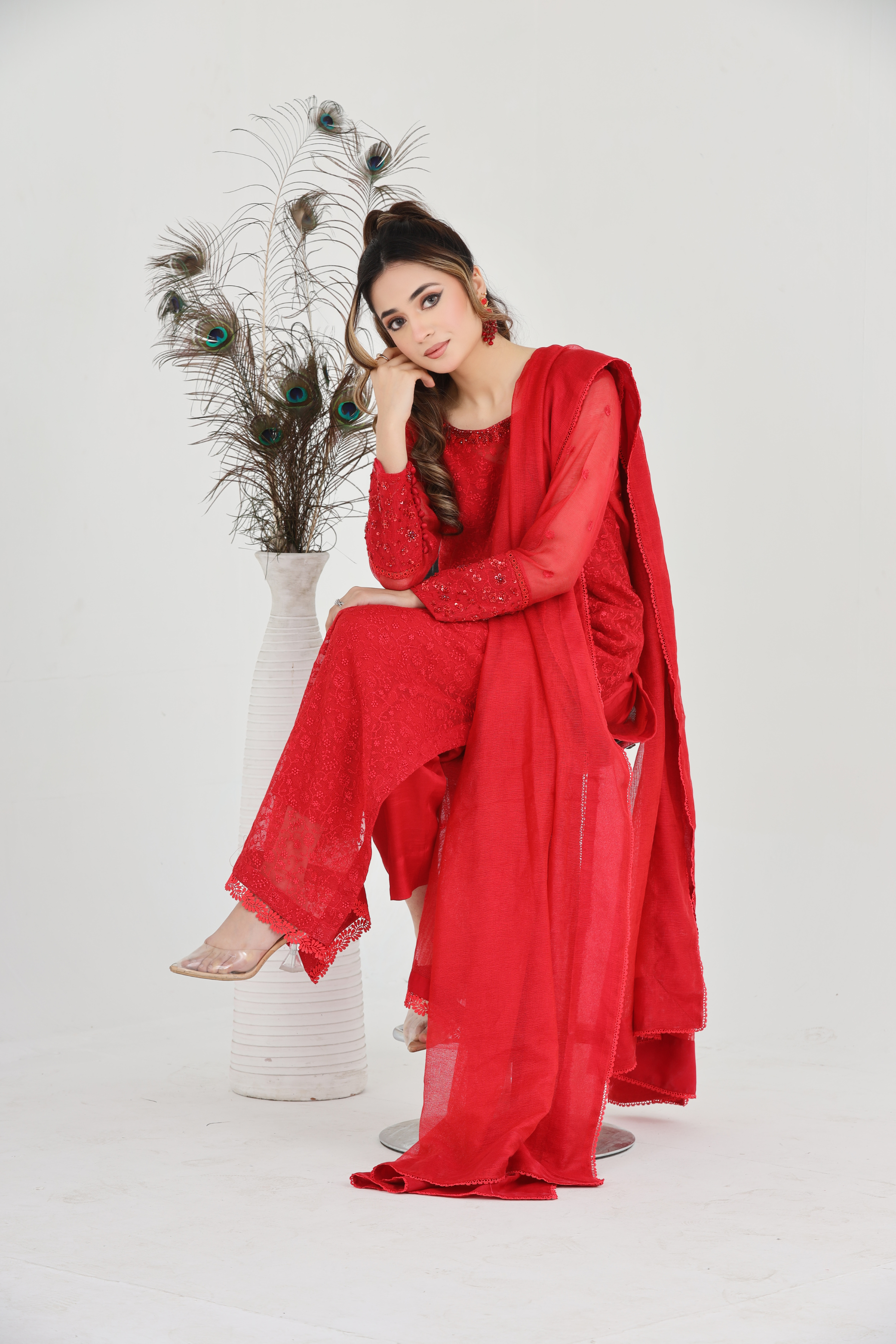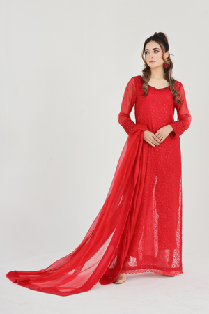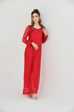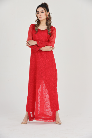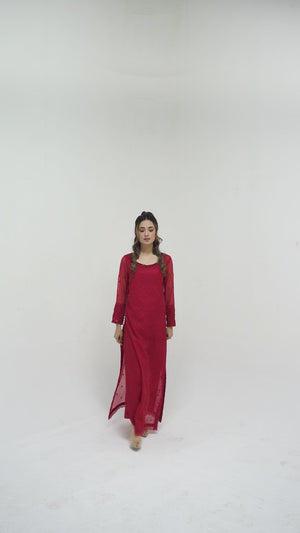 This Crimson Red Khadi net shirt, with embroidered details, Cutdana, and Moti work, is enhanced by laces and button detailing. It pairs with Sheesha Silk pants and a red Khadi net dupatta with lace accents. The length of the shirt is 54 inches & the model is wearing small size.