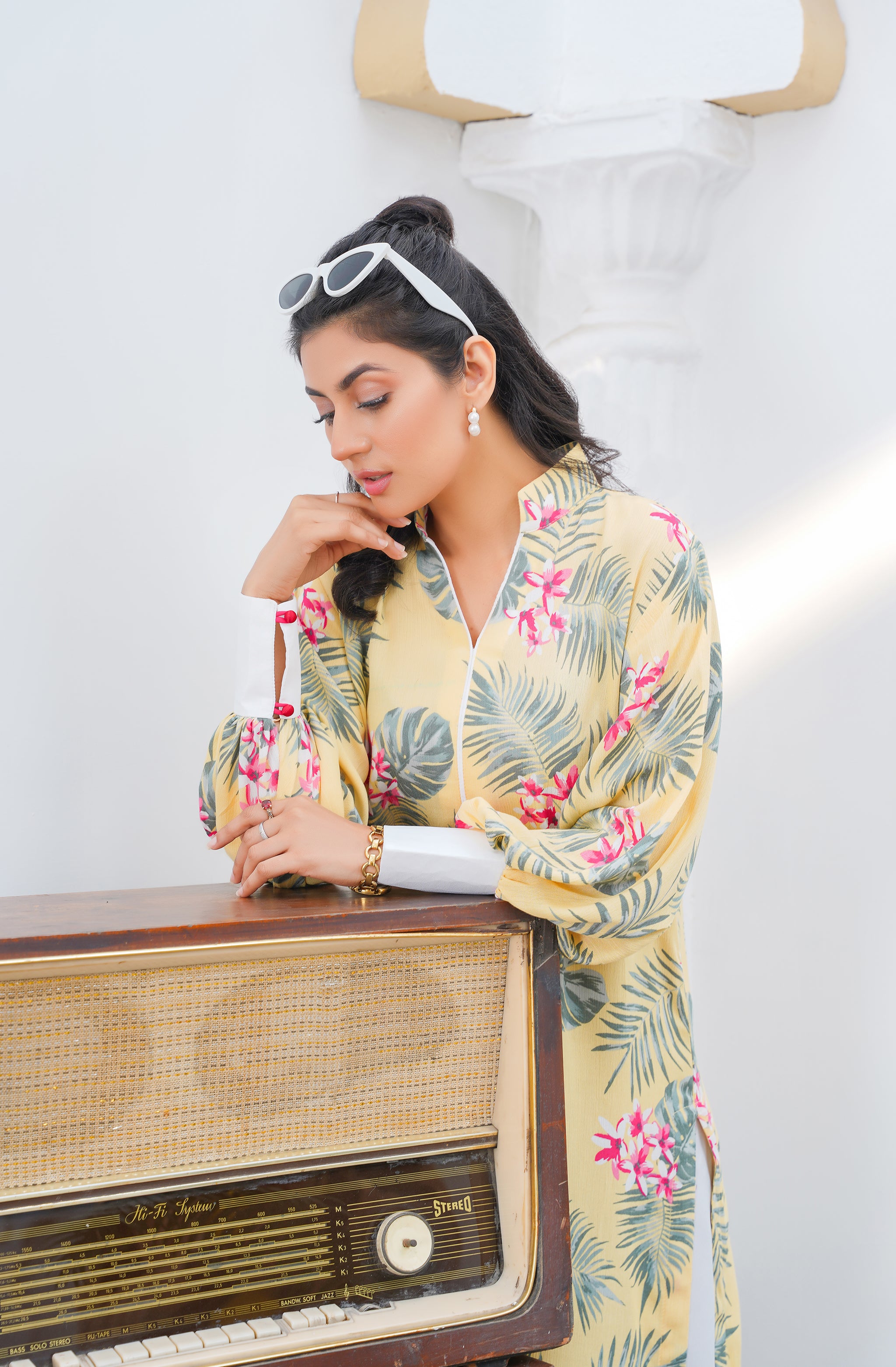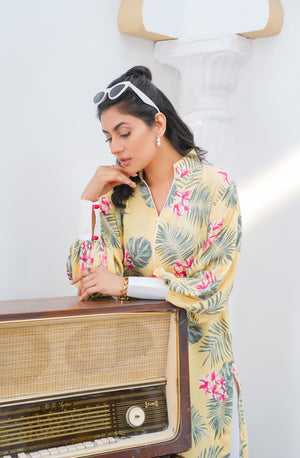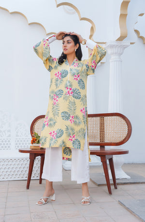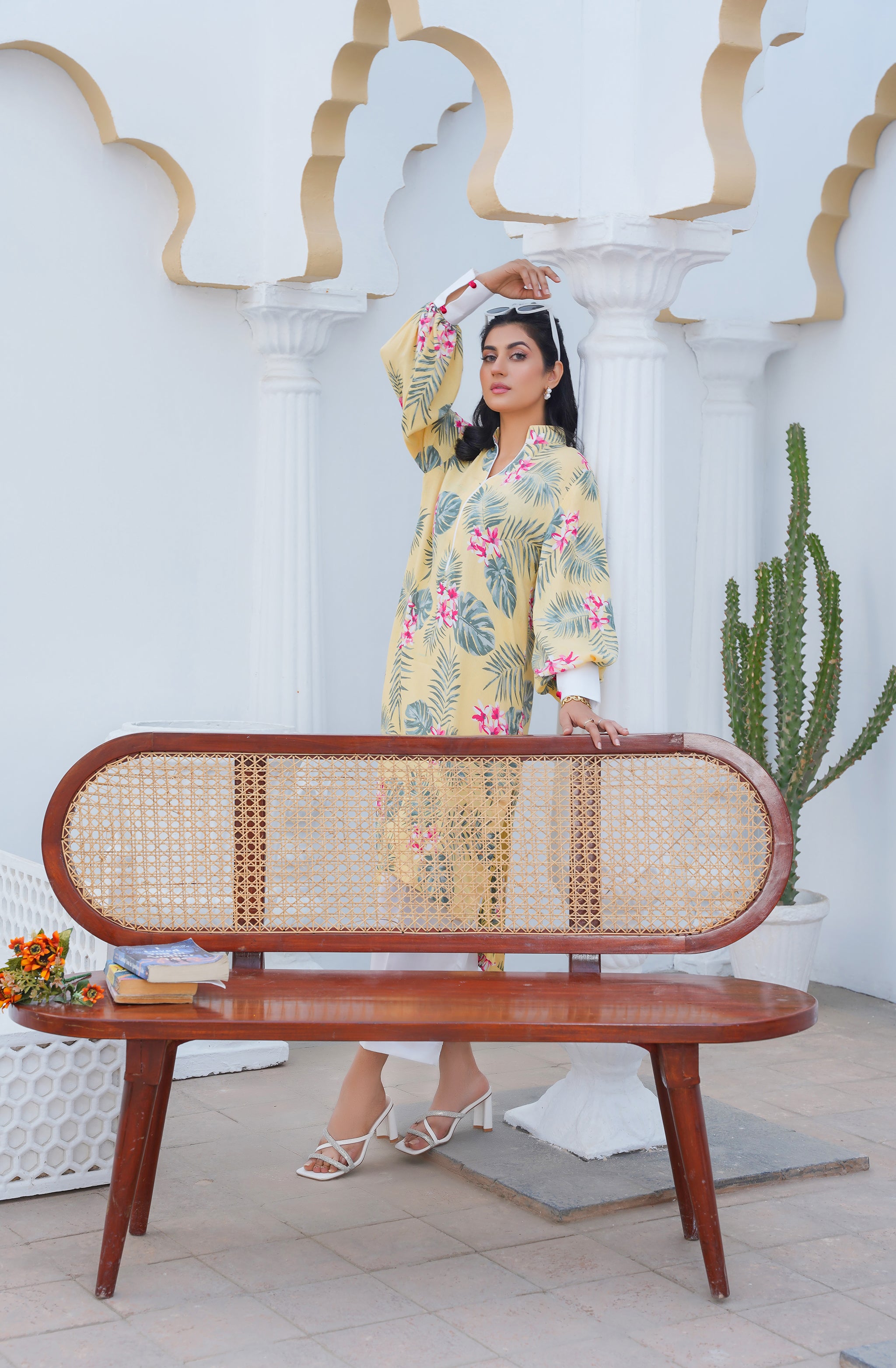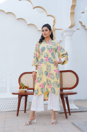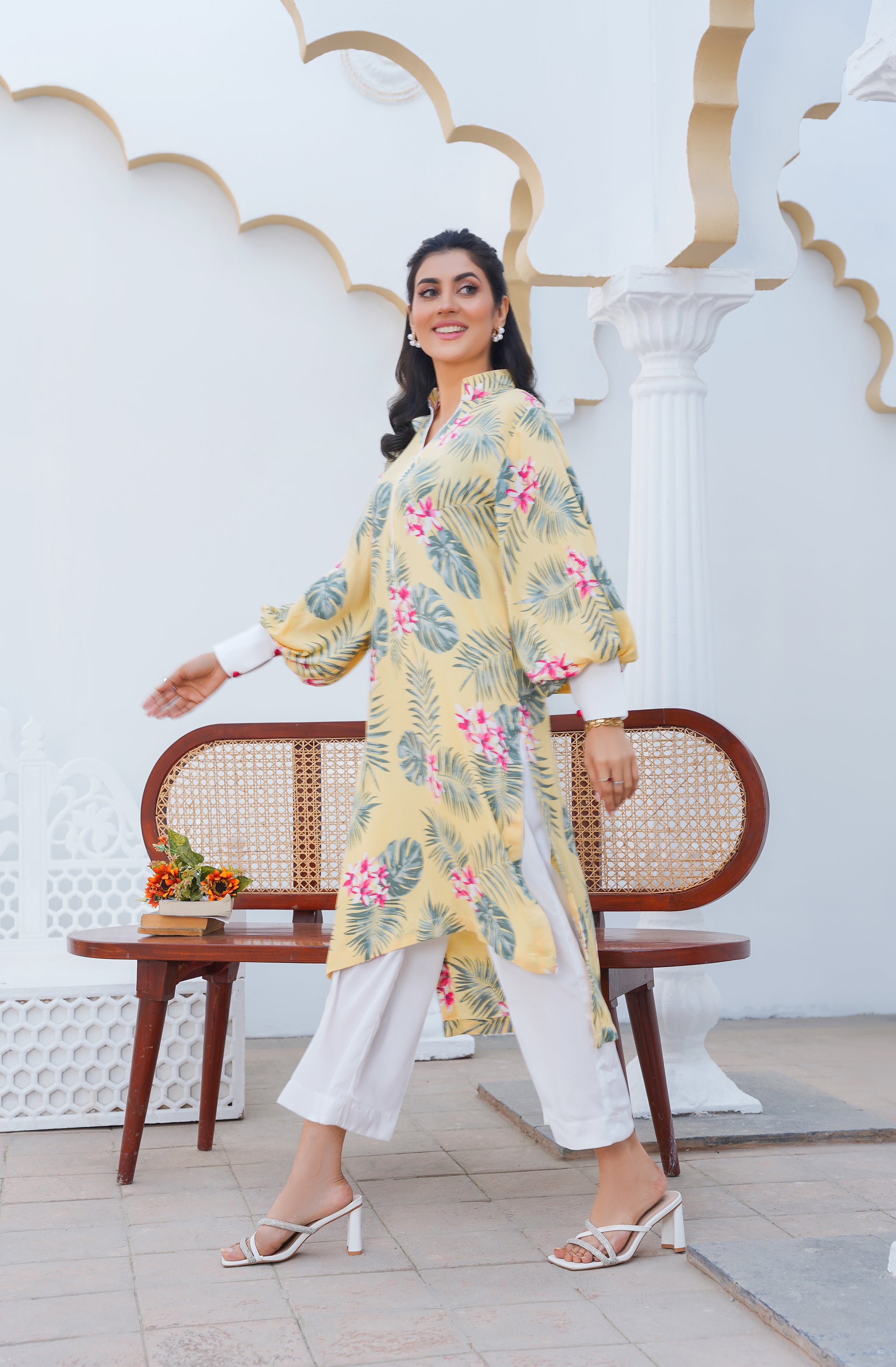 Description: Style yourself in the soft charm of this lime yellow ensemble, featuring a standing collar and bishop sleeves. Paired with box trouser. The shirt length is 41”, and the trouser length is 36”. The model is wearing a small size.