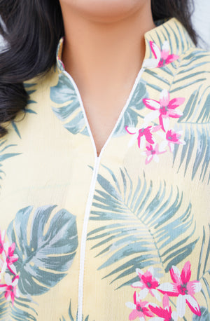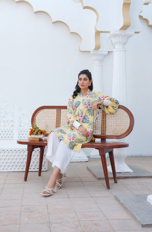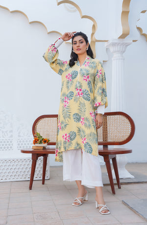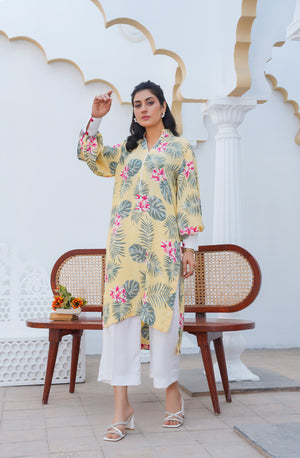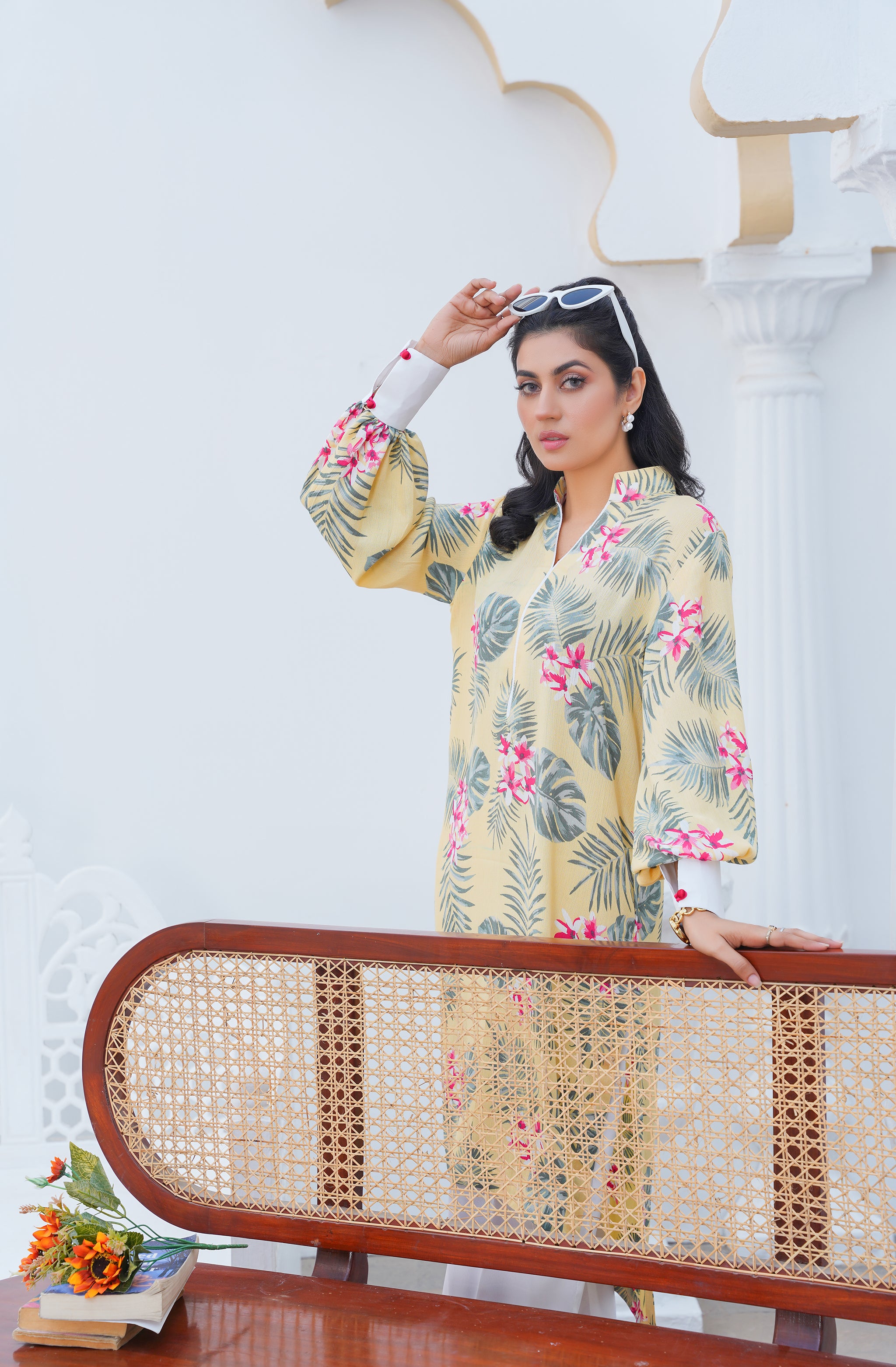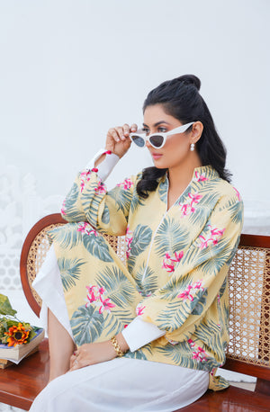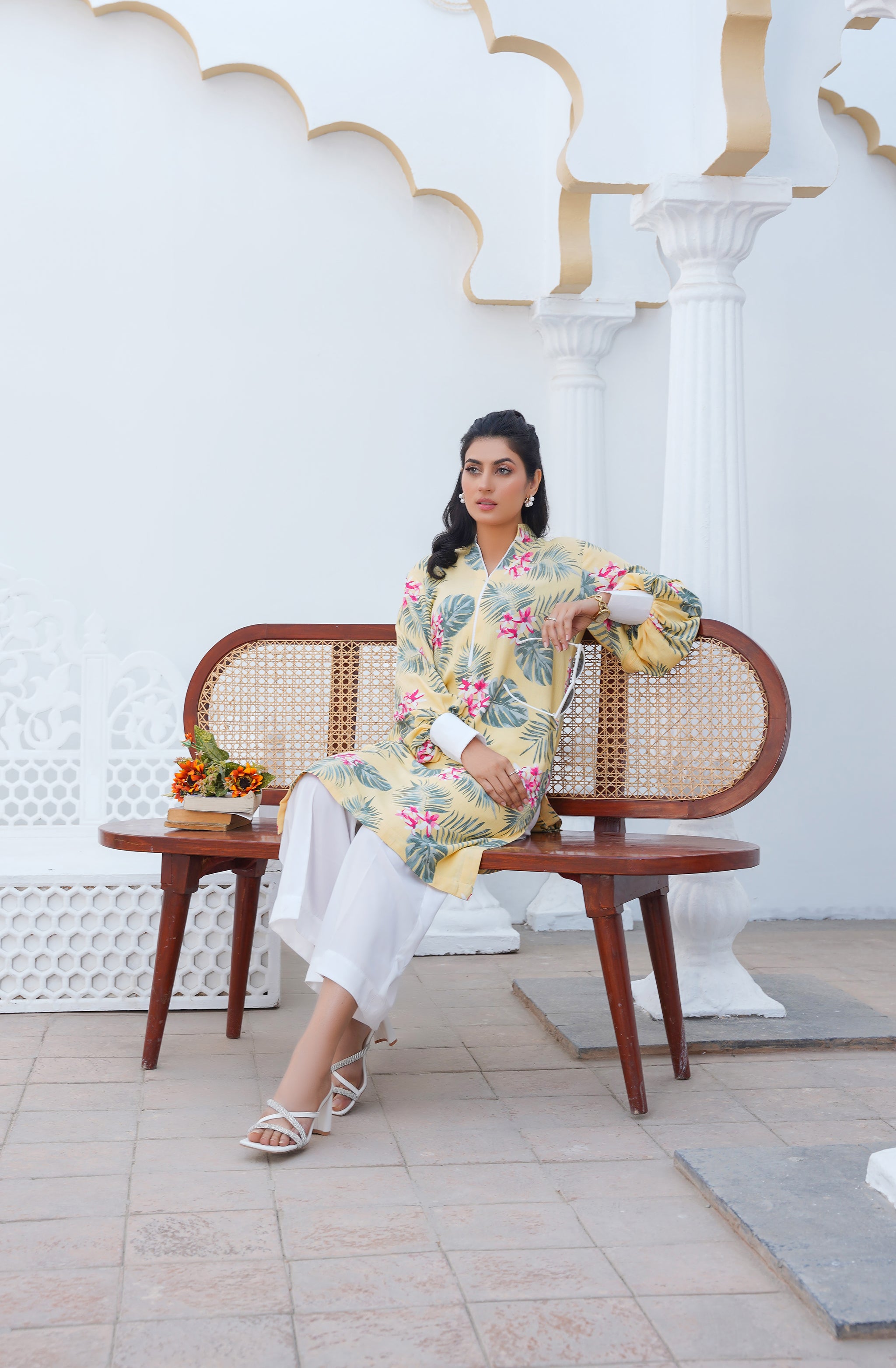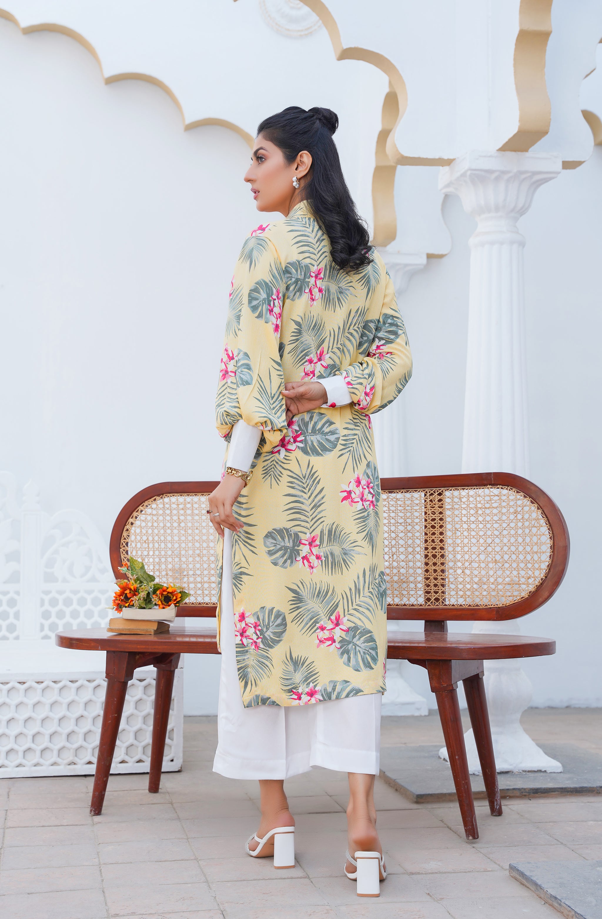 Description: Style yourself in the soft charm of this lime yellow ensemble, featuring a standing collar and bishop sleeves. Paired with box trouser. The shirt length is 41”, and the trouser length is 36”. The model is wearing a small size.