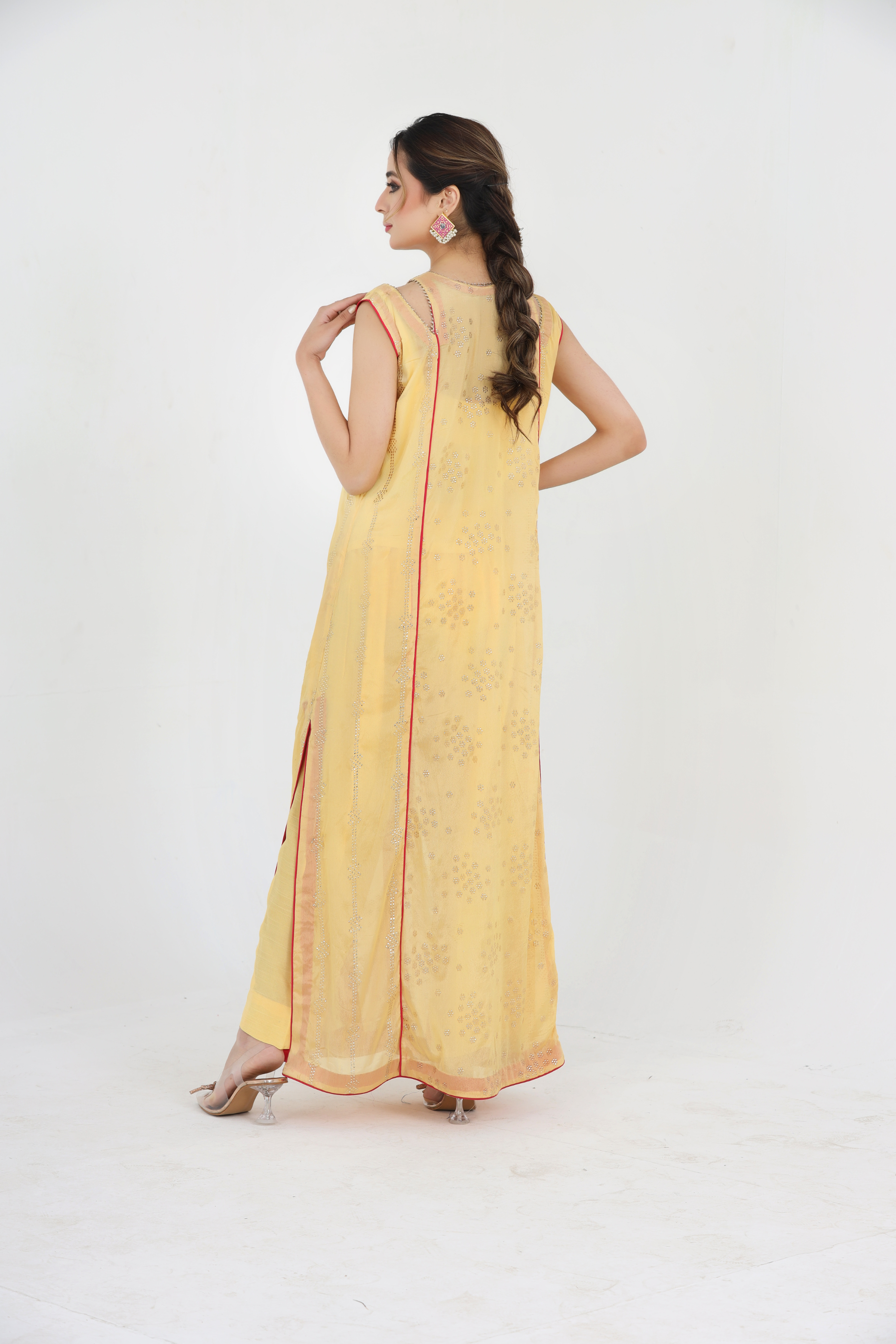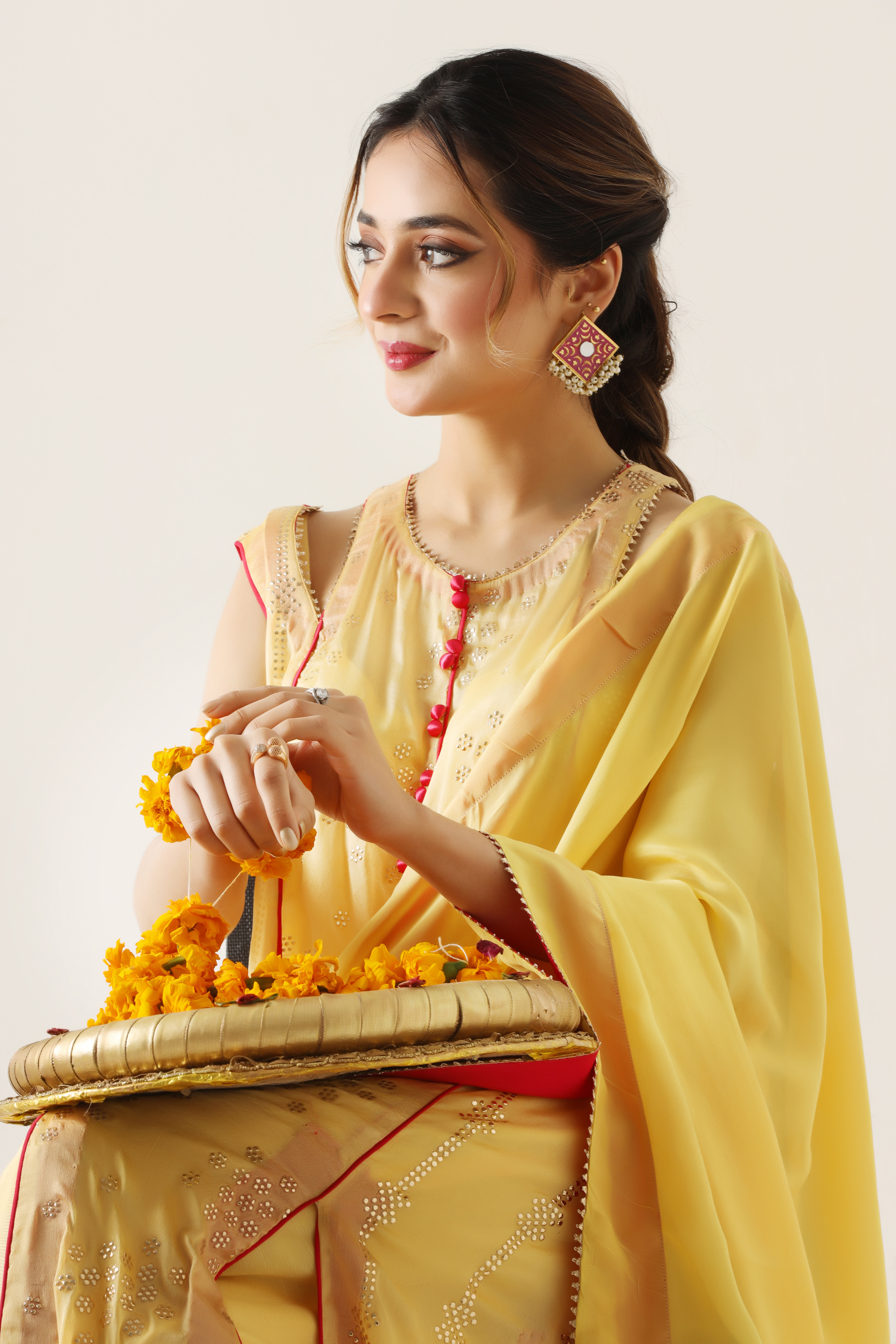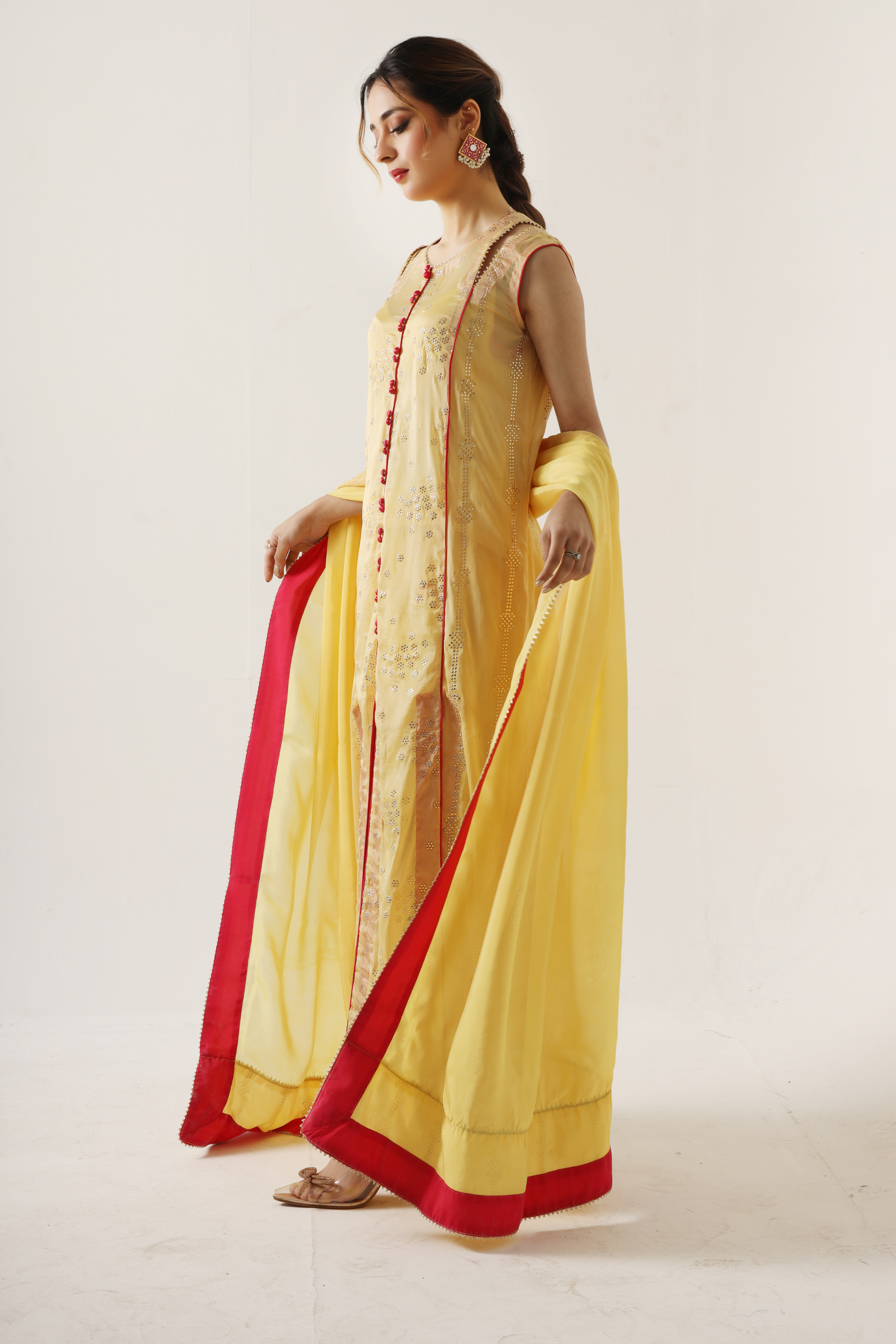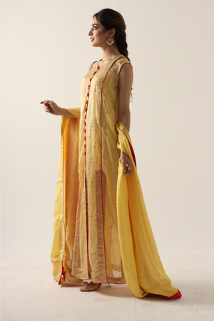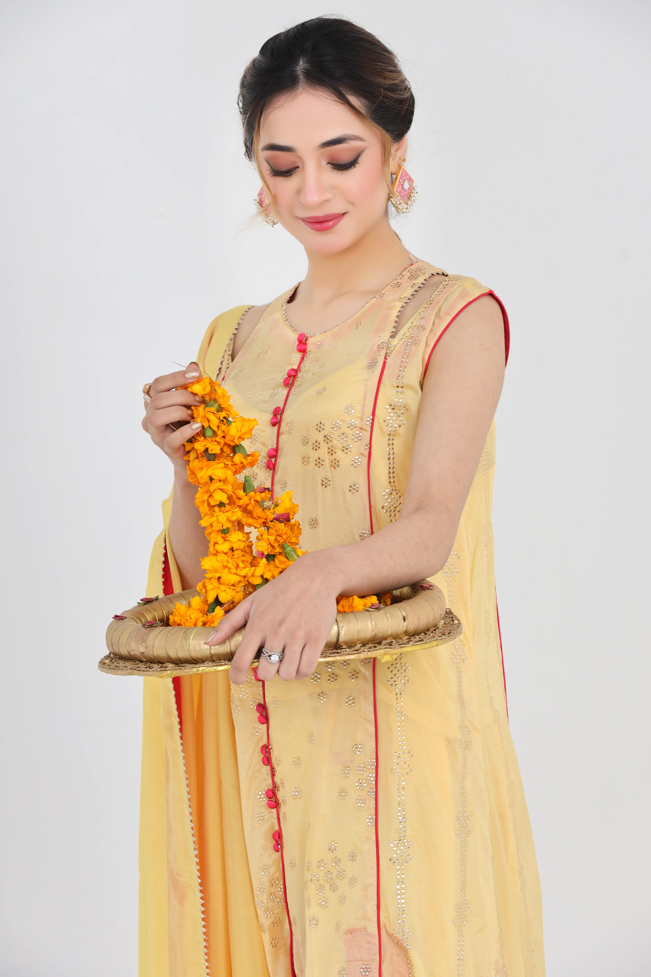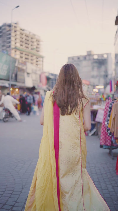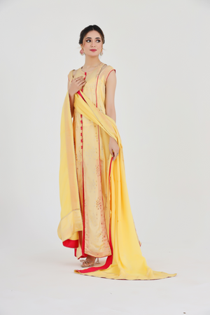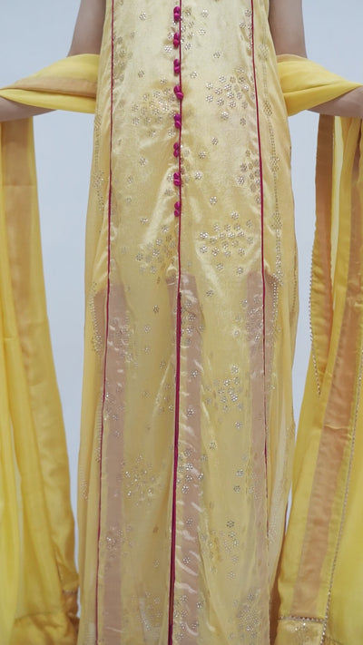 The chrismatic Pale Gold shirt with mukesh work, showcasing unique cutlines on the neck and shirt tail, paired with Sheesha Silk pants. The dress is complemented with Silk dupatta with Mukesh pallu and lace detailing. The length of the shirt is 48-49 inches & the model is wearing small size.