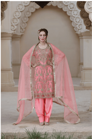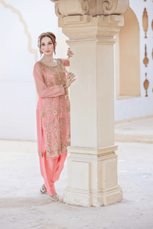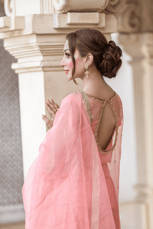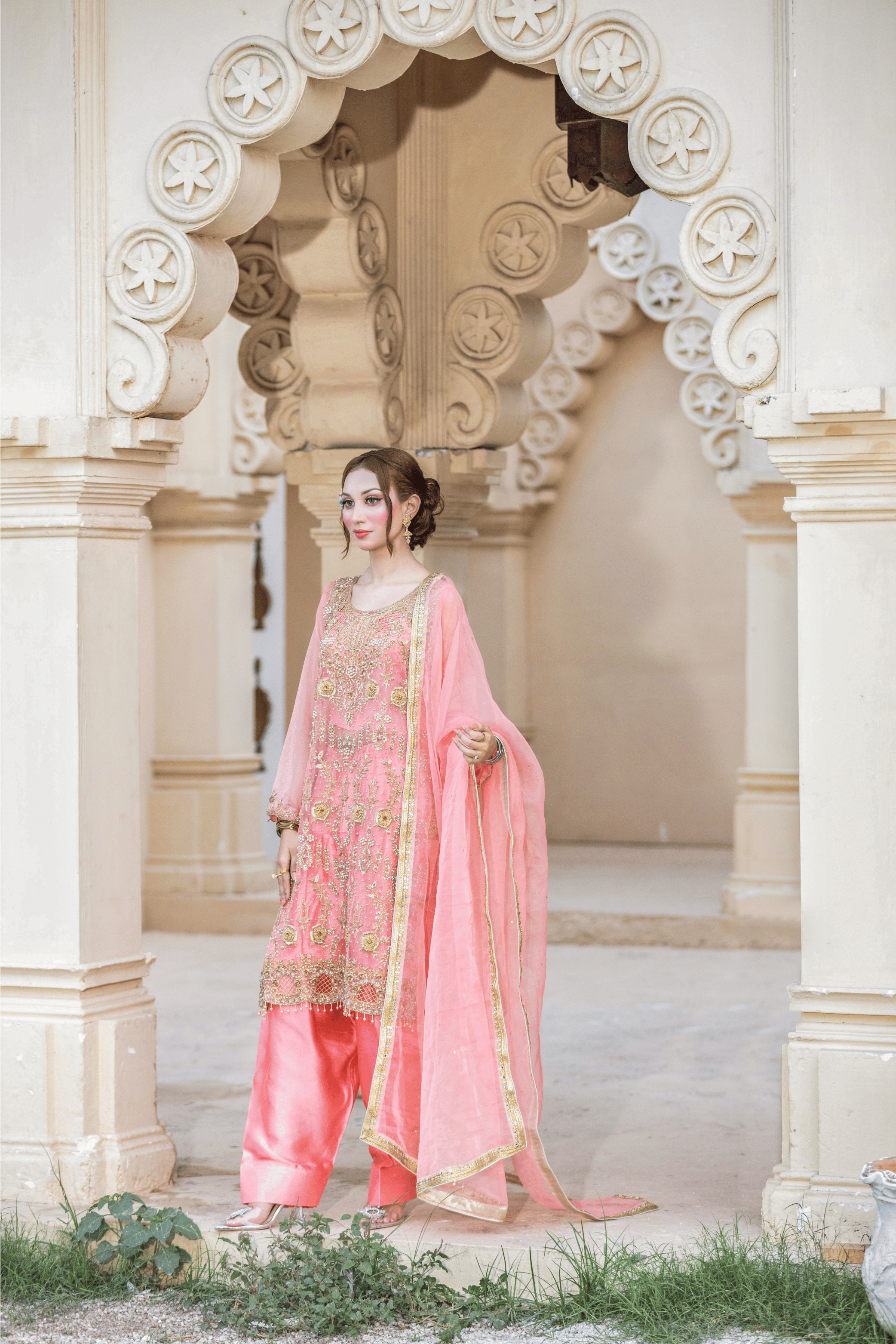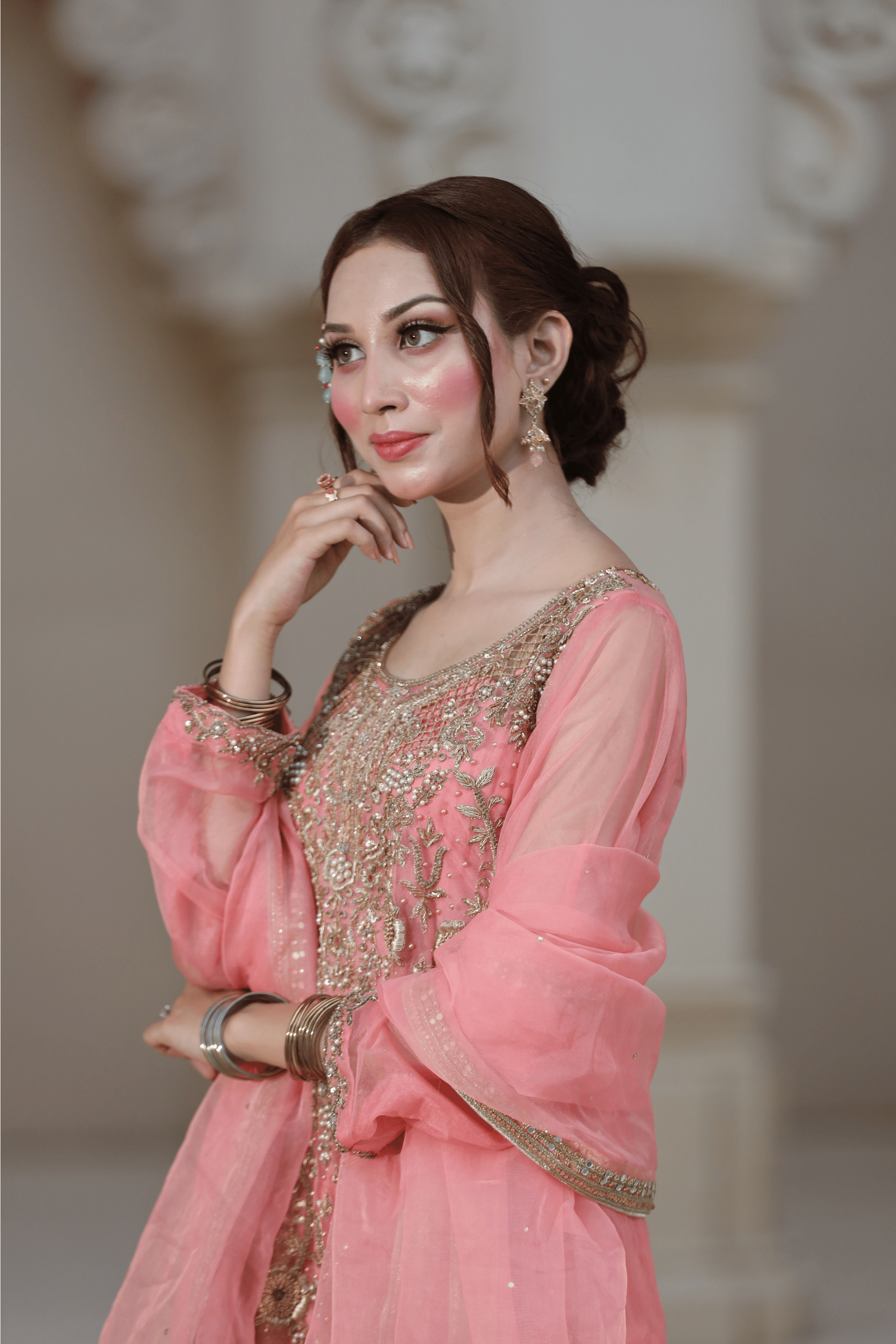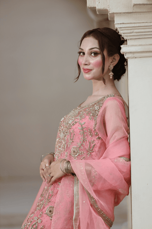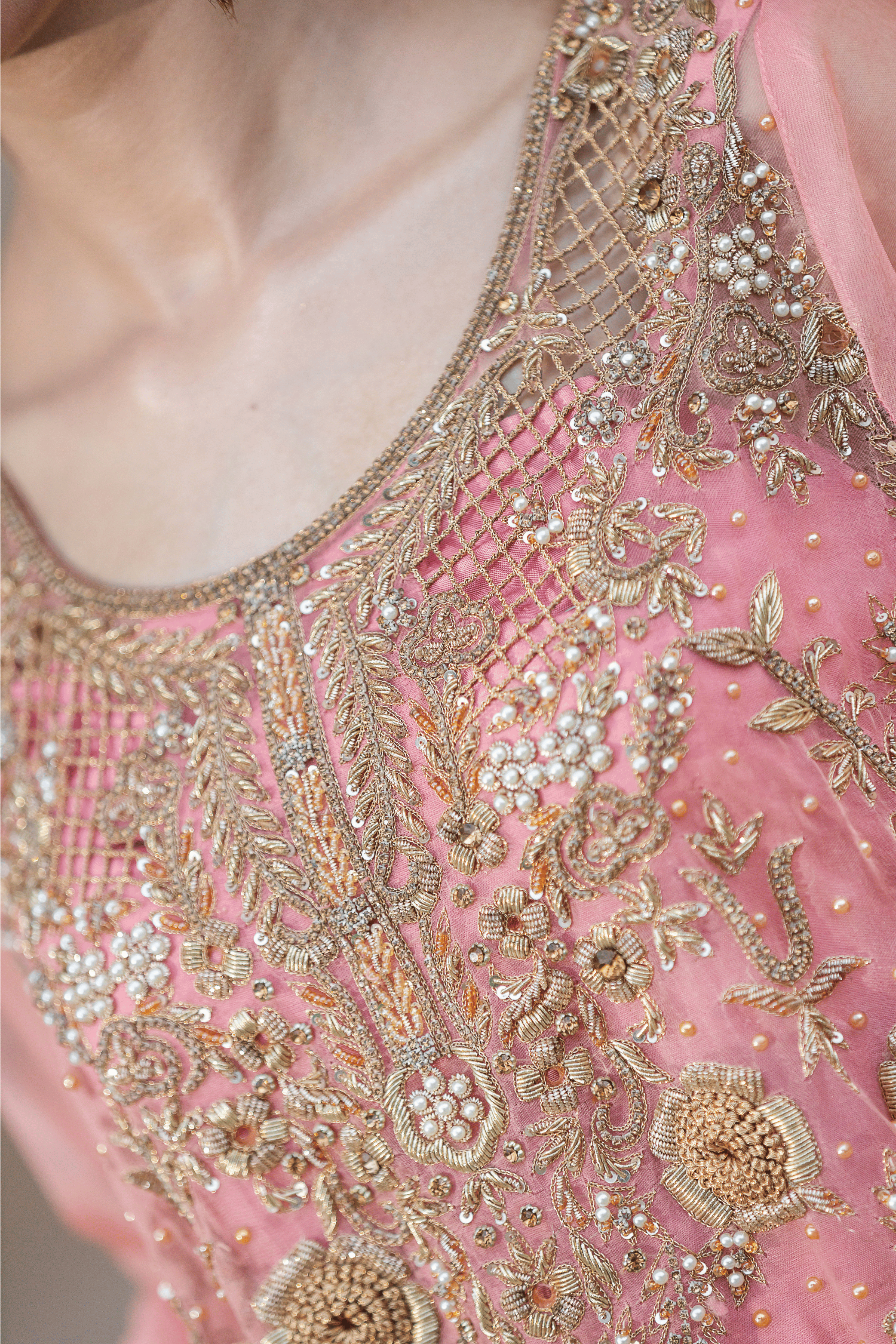 Utterly feminine and perfect example of pretty in Blush Pink made on Pure Organza comes in a 3 piece outfit. Shirt is embellished with kora Dabka and Arri work with french knots. The shalwar is Sheesha Silk with chora paincha. In short the dress is perfect for any wedding occasion. Length of this shirt is 35 inches & the model is wearing medium size.